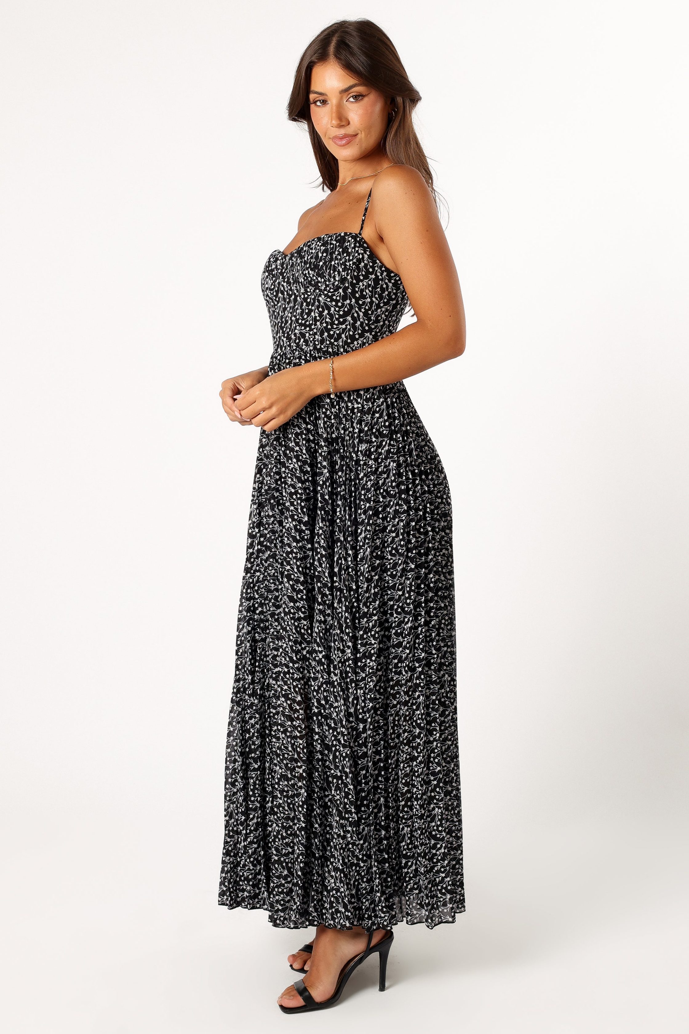 This gorgeous maxi dress is a must-have for your wardrobe. Every detail exudes sophistication – from the sweetheart neckline, thin adjustable straps, and padded cups with underwire in the bust, to the back shirred panel and invisible zipper at the back. maxi length sweetheart neckline thin adjustable straps padded cups with underwire in bust back shirred panel invisible back zip with hook and eye clasp pleat detail black floral print design partially lined material – 100% polyester SIZING Studio model is 5'8" and wears a size XS model stats: bust – 31.5", waist – 25.2", hips – 32.3" Modern Romance Campaign; Dekota is 5'8" and wears a size XS model stats: bust – 31.5", waist – 25.2", hips – 32.3" Sierra is 5'7" and wears a size M model stats: bust – 35", waist – 29.1", hips – 41.9" GARMENT CARE cold hand wash separately