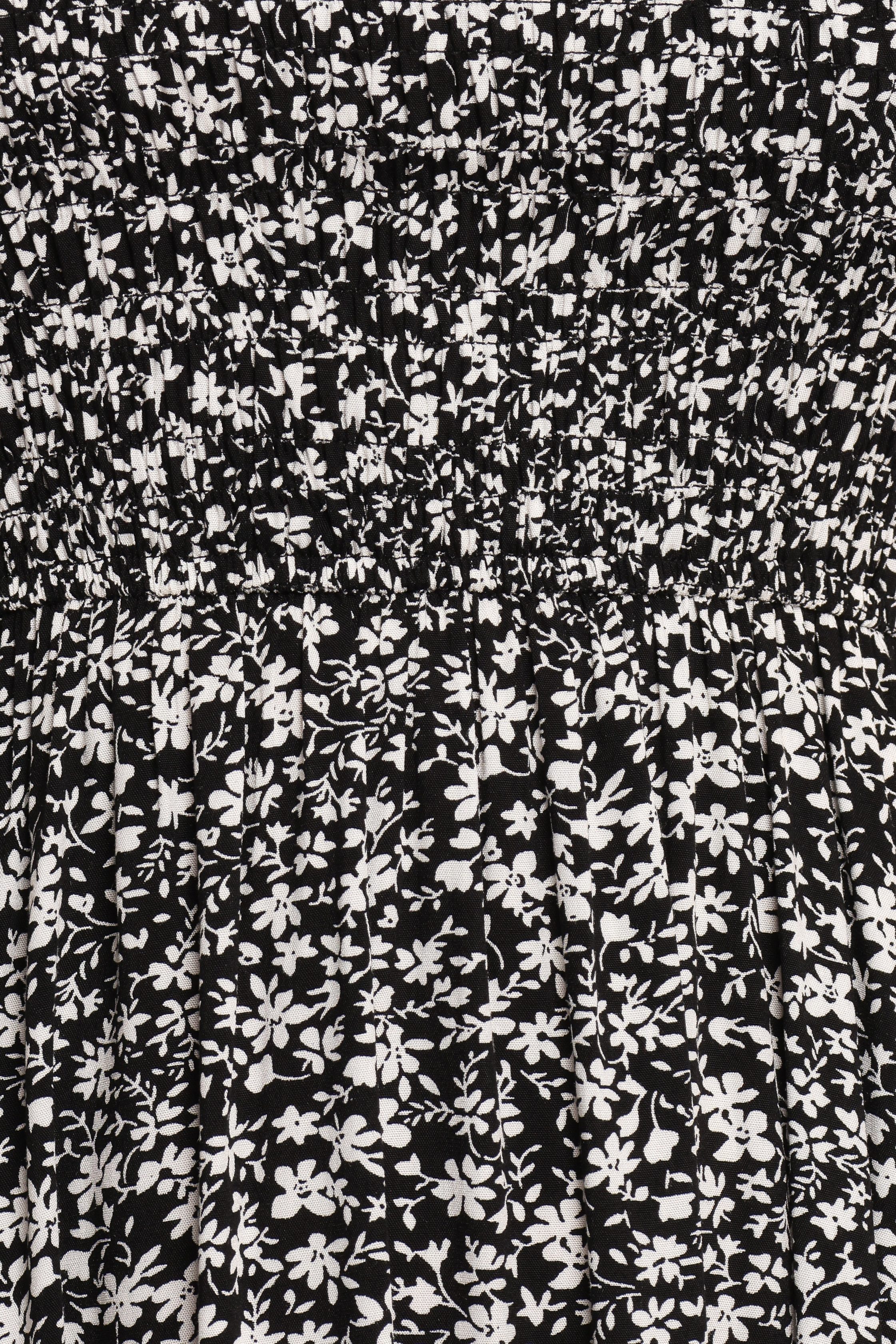 This dress beautifully balances sophistication and comfort, perfect for any occasion where you want to leave a lasting impression. The high round neckline and sleeveless design provide a contemporary silhouette, while the elasticized shirred bodice and A-line skirt ensure a flattering fit for any body shape. midi length high round neckline sleeveless design elasticised shirred bodice functional pockets a-line skirt design black floral print unlined material – 100% rayon SIZING studio model is 5’7â€cm and wears a Size XS model stats: bust – 34â€, waist – 24â€, hips – 35†GARMENT CARE cold hand wash separately