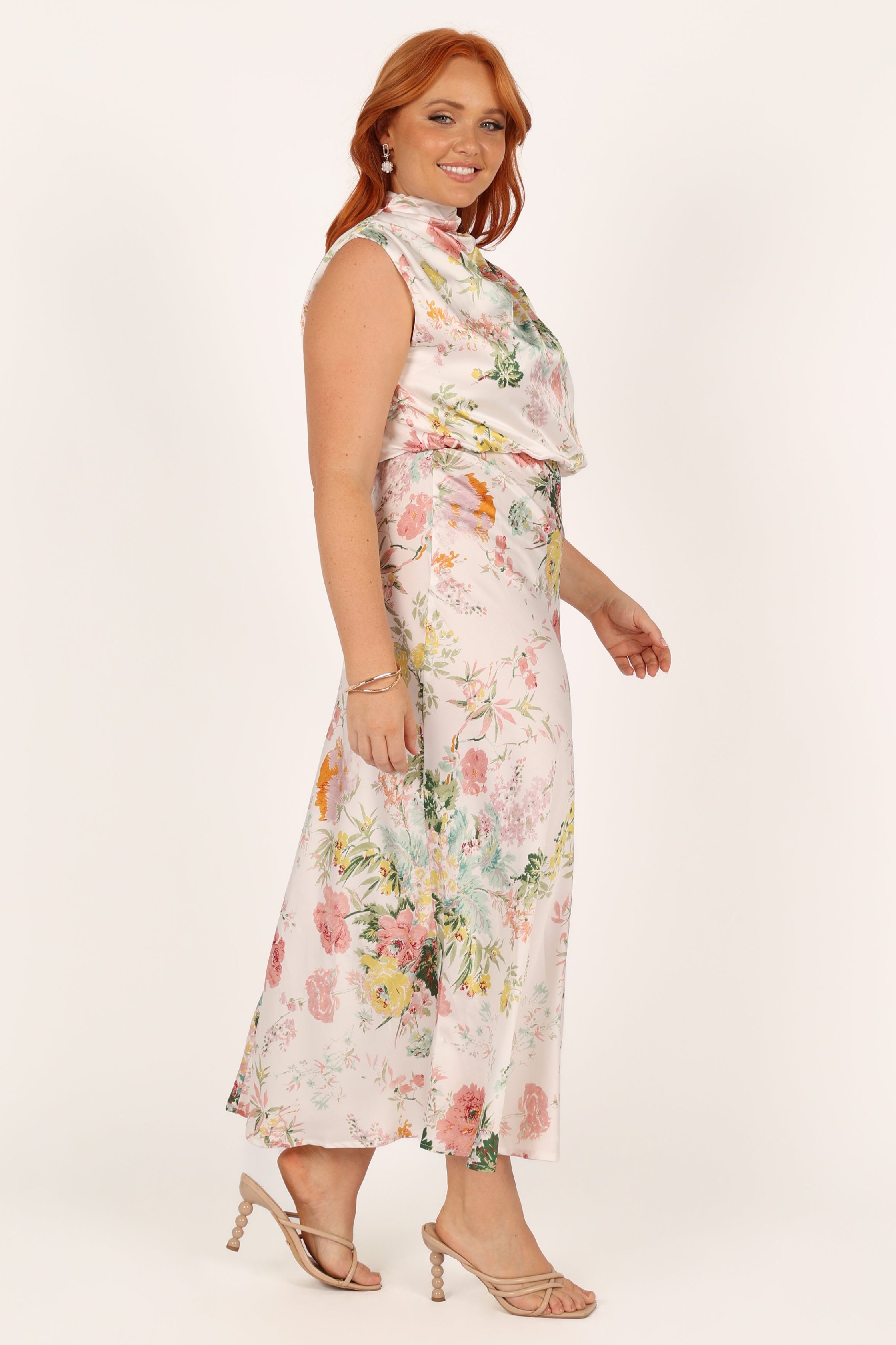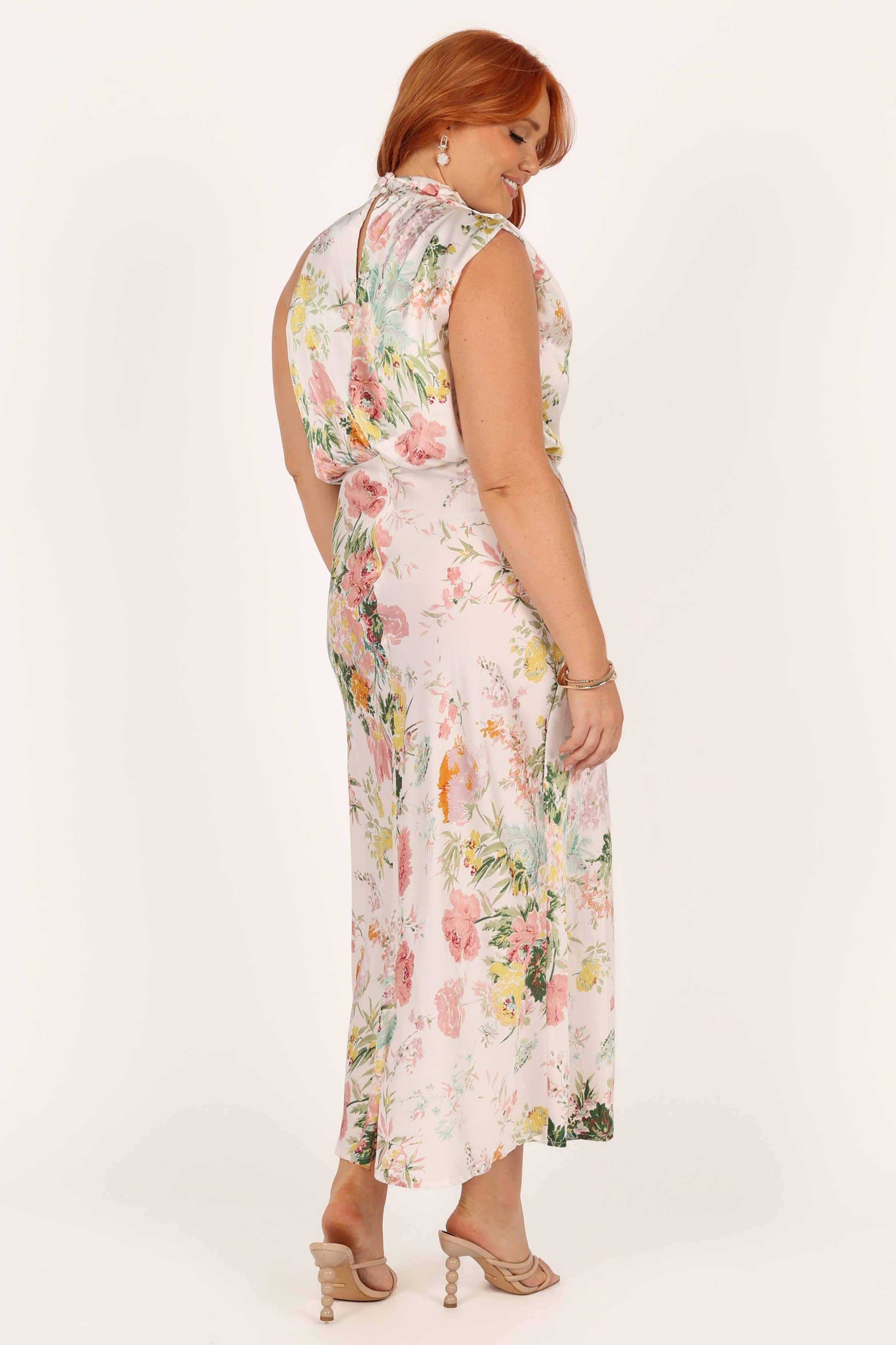 Look and feel your best in this stunning event wear dress! Featuring a midi length, an asymmetric high round neckline with gathered pleat detail, plus a back neck opening with button close, it's the perfect party dress for any special occasion. Not only does it look fabulous, but it feels as good as it looks too, crafted from a soft satin feel just for extra comfort. midi length sleeveless design asymmetric high round neckline back neck opening with button close gathered pleated detail on neckline back invisible zip soft satin feel large floral print partially lined material – 100% polyester SIZING model 1 is 5' 8" and wears L model stats 1: bust – 39.5", waist – 32.5", hips – 43.5" model 2 is 5' 10" and wears a Size S model stats 2: bust – 35", waist – 26.5", hips – 37.5" GARMENT CARE cold hand wash separately