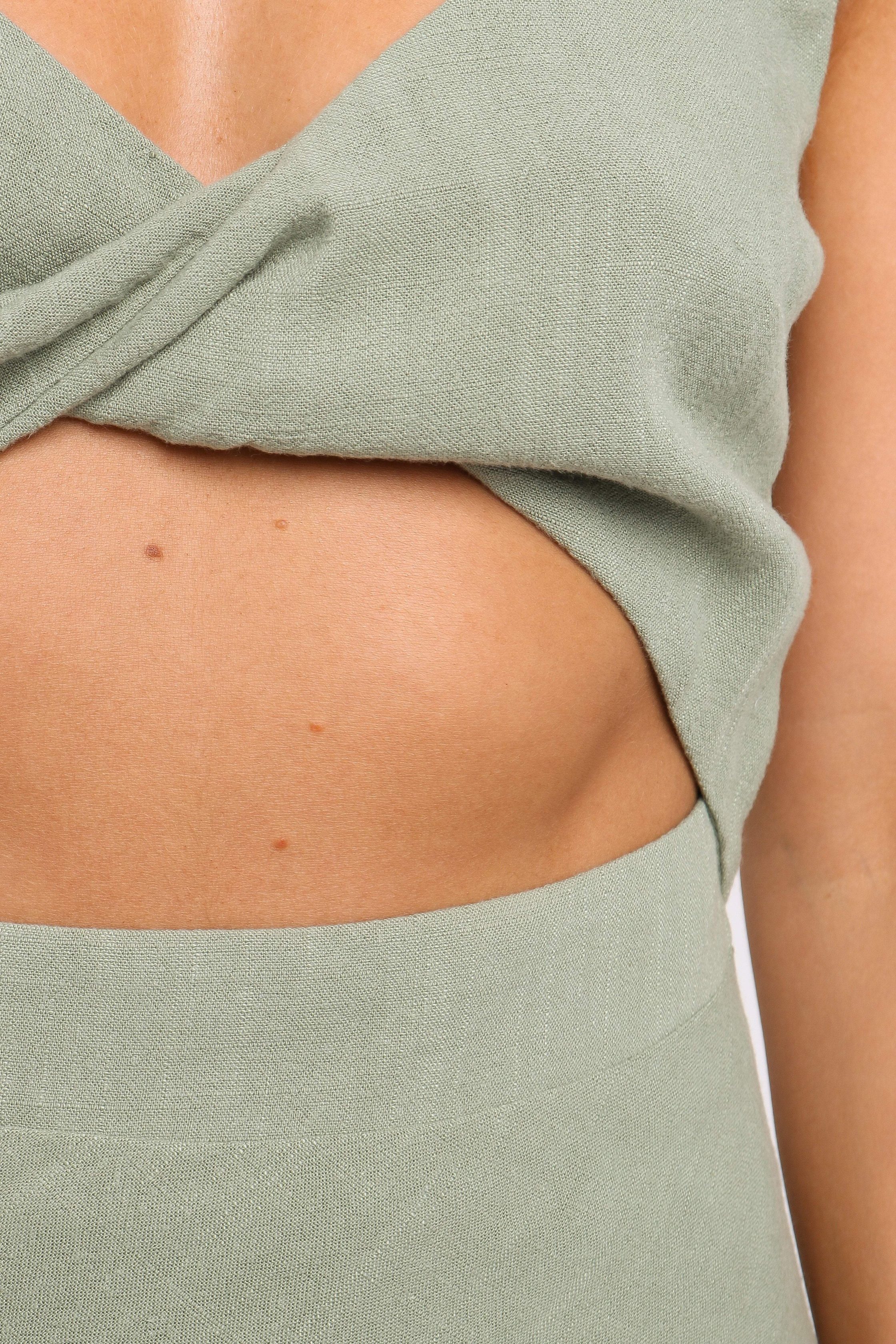 Take your style to new heights in this chic midi length dress! The flattering v neckline creates a timeless silhouette while the bust twist detail with cut out feature adds a touch of glamor. For an extra bit of security, the dress is finished off with a hook and eye clasp and invisible back zip. midi length v neckline bust twist detail with cut out feature hook and eye clasp invisible back zip lined material – cotton/polyester this dress has a linen look finish to its fabric SIZING model is 5' 6" and wears a Size 2 model stats: bust – 30", waist – 22.5", hips – 36" GARMENT CARE cold hand wash separately