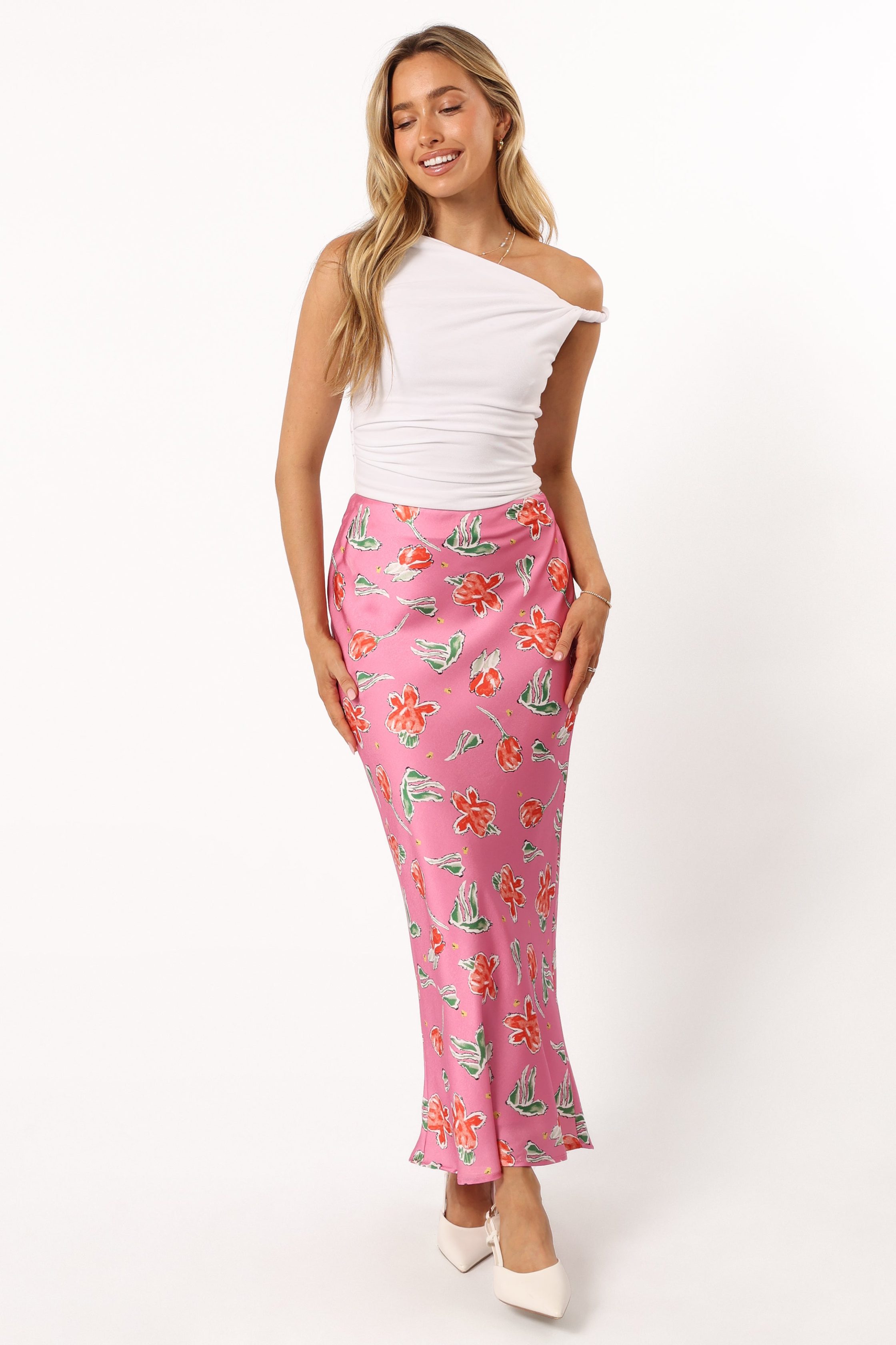 This midi length skirt is the perfect addition to your wardrobe. The slip style with invisible side zip ensures a comfortable fit, while the floral print detail gives it an extra touch of fun. slip style skirt midi length invisible side zip floral print design soft satin feel lined material – 100% polyester SIZING model is 5' 5" and wears a Size XS model stats: bust – 31.5", waist – 25.5", hips – 37" GARMENT CARE cold hand wash separately