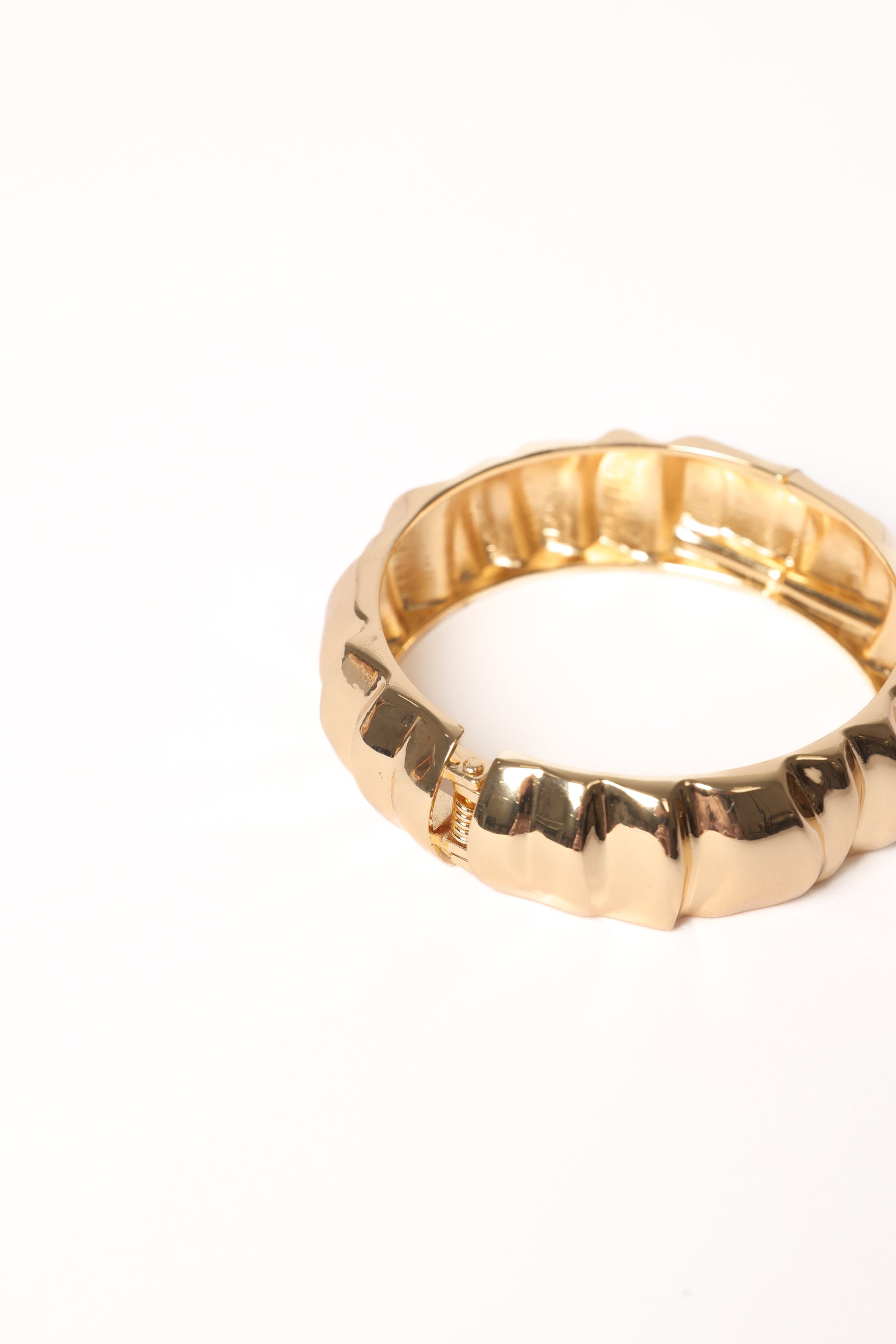 DETAILS Add a touch of modern elegance to your look with the Beatrix Bracelet in Gold. This cuff bangle features sleek gold hardware and a refined design that effortlessly transitions from casual outings to formal events. cuff bangle style gold hardware clasp closure material – 100% alloy MEASUREMENTS diameter – 3"