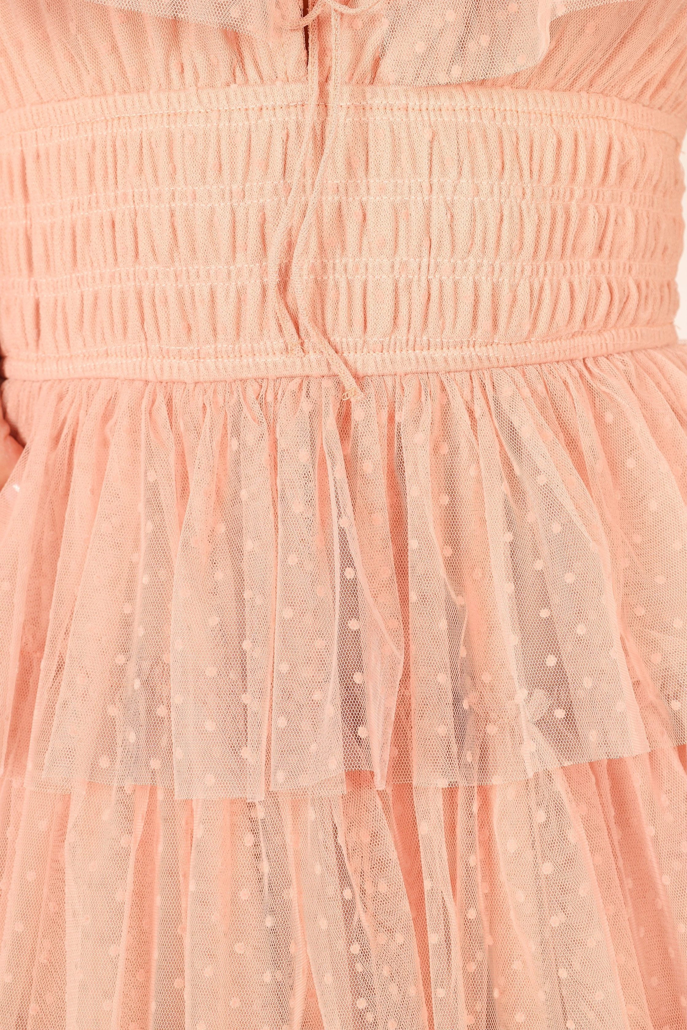 Be the belle of the ball in this stunning tulle maxi dress! Featuring a square neckline with tie close, thin elasticised straps with ruffle detail and a front cut out on the bust, this dress is sure to turn heads. square neckline with tie close thin elasticised straps with ruffle detail front cut out on bust elasticised shirred waist band drop tiered ruffle tulle skirt pull on design lined material – 100% nylon lining – 100% polyester SIZING model is 5' 8" and wears a Size S model stats: bust – 30.5", waist – 24", hips – 36.5" GARMENT CARE cold hand wash separately