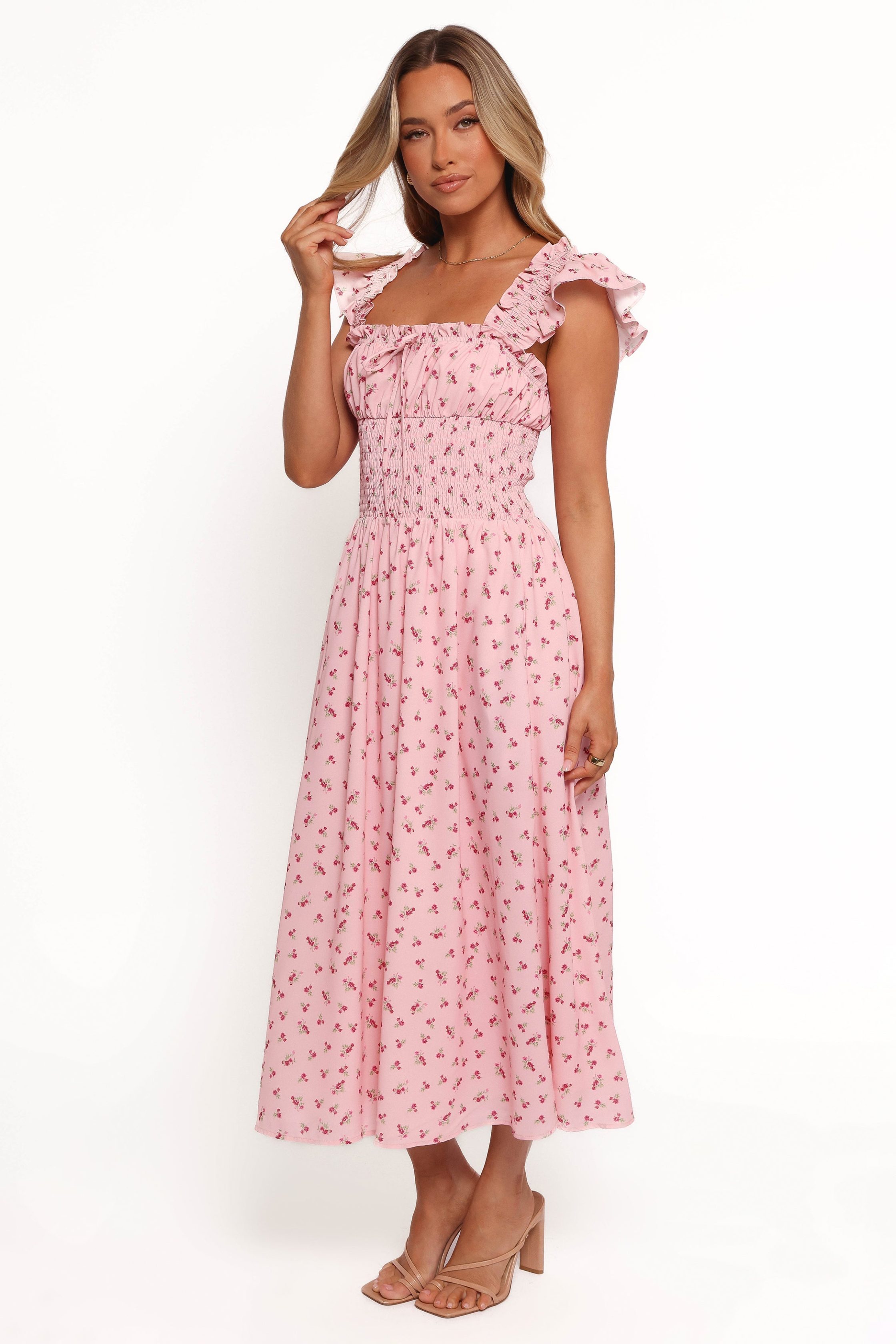 DETAILS The elasticised square neckline, adorned with a charming bow tie detail, frames your face beautifully, while the shirred waist design accentuates your silhouette in all the right places. midi length style elasticised square neckline with bow tie detail thick elasticised straps with shoulder frill feature shirre
