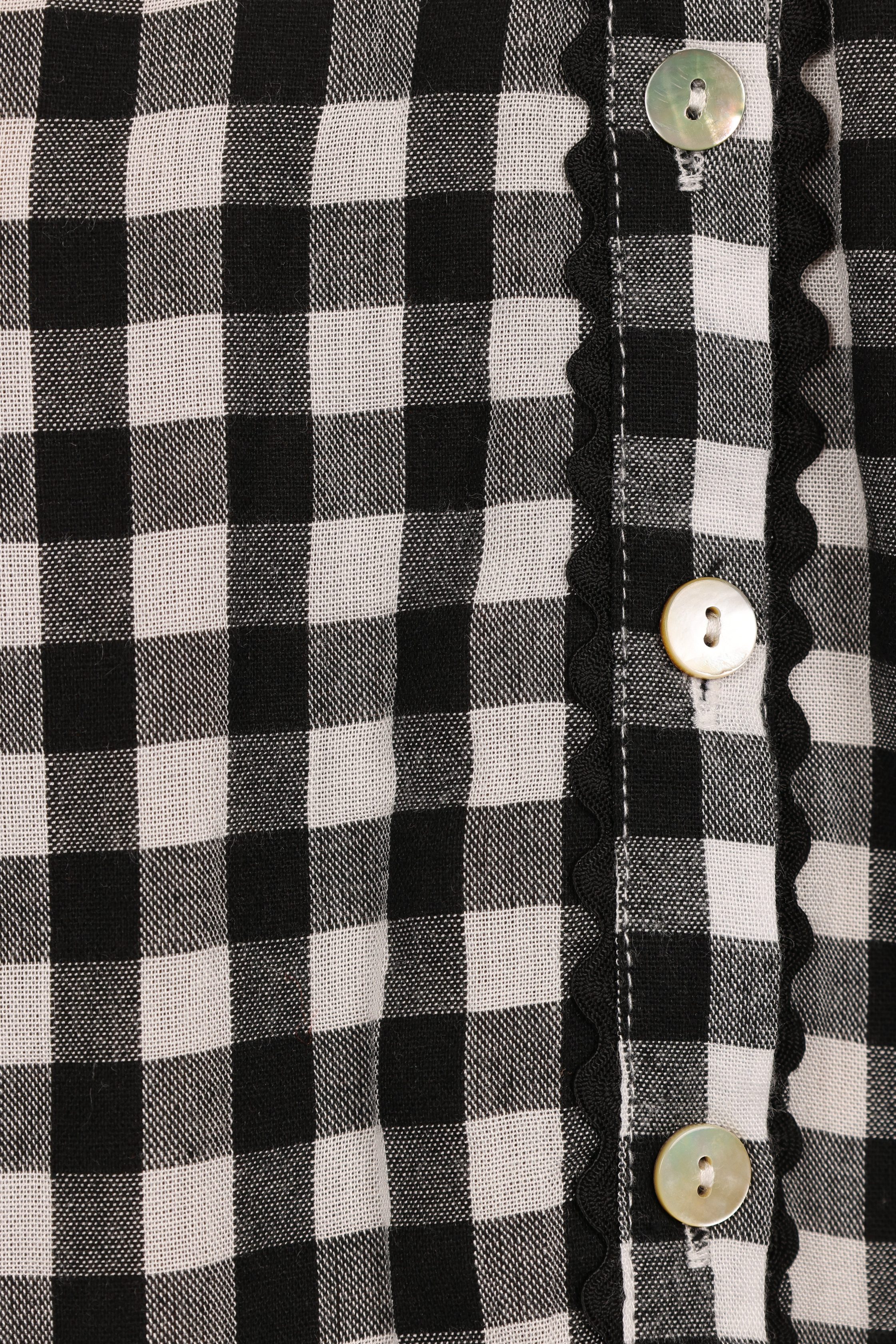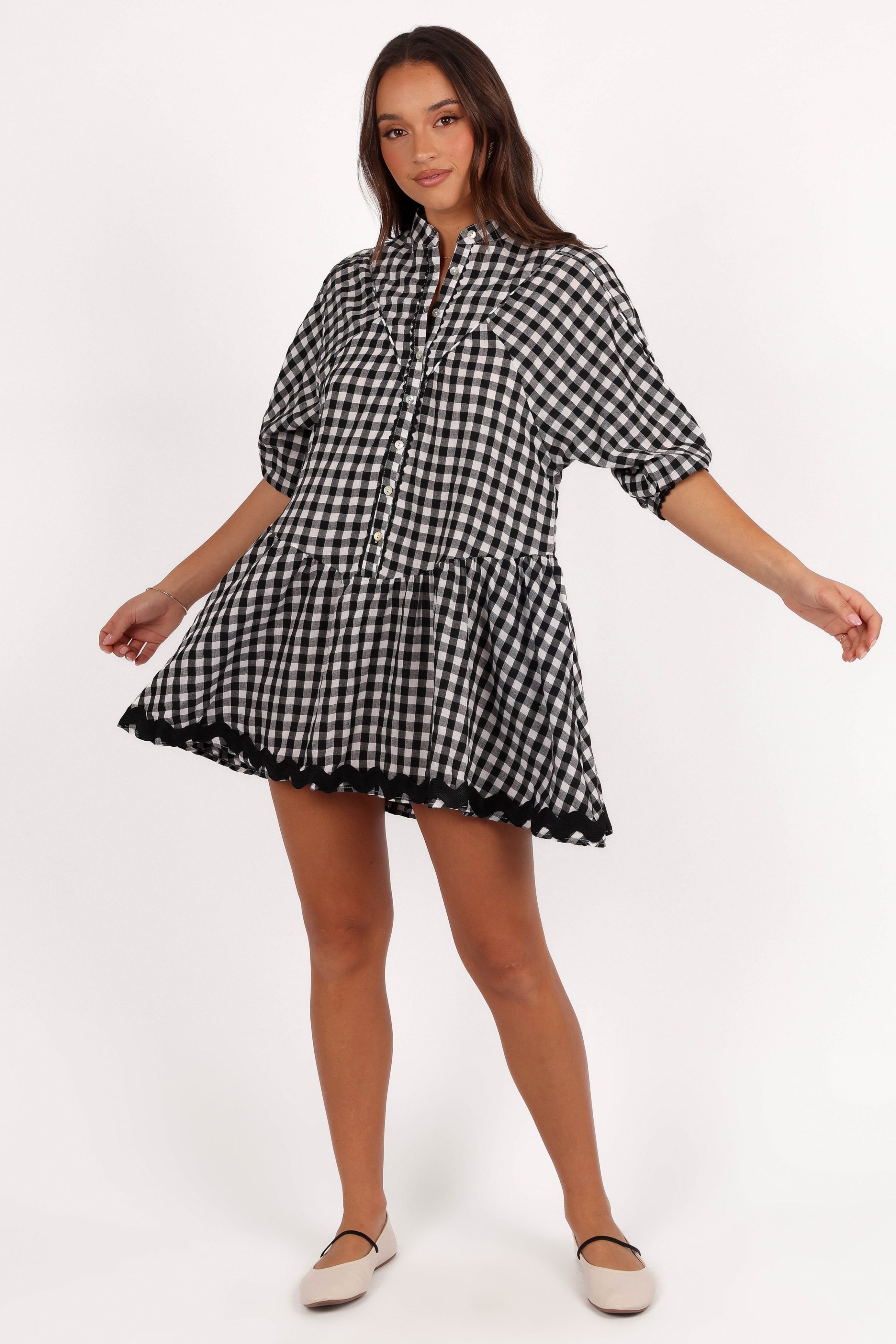 Designed for the fashion-forward woman who appreciates both comfort and style, this mini dress is a versatile addition to your wardrobe. Whether you're pairing it with sandals for a casual day out or dressing it up with heels for a chic evening look. mini length high round neckline short sleeves functional button down ric rac trim on hem gingham print unlined material – 100% cotton SIZING model is 5' 7" and wears a Size S model stats: bust – 33", waist – 26", hips – 38" GARMENT CARE cold hand wash separately