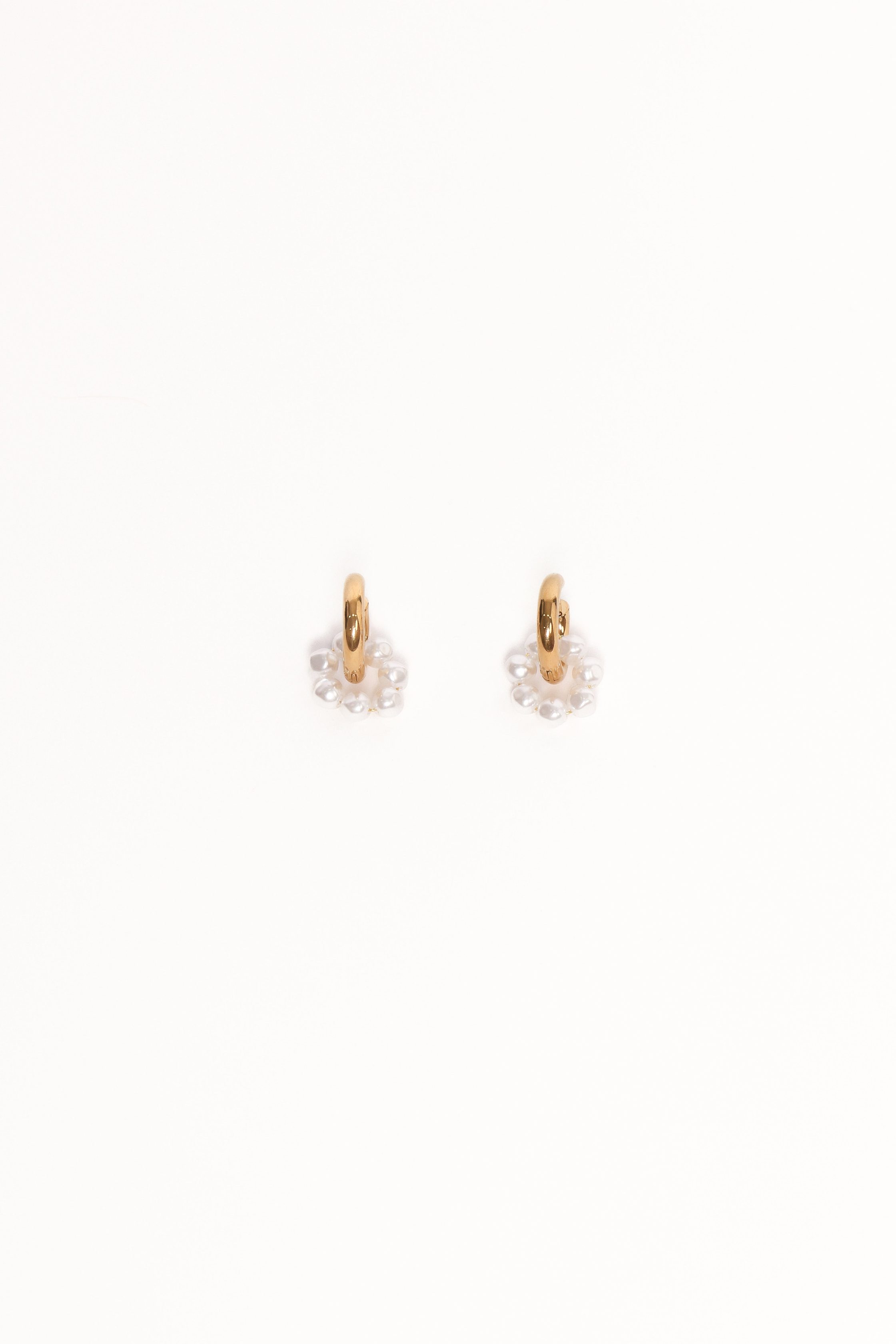 DETAILS Add a touch of elegance to your look with the Cheri Earrings in Gold/Pearl. Featuring a timeless gold hoop paired with a delicate faux pearl detail, these gold-plated beauties elevate any outfit. With a secure clasp close, they're the perfect mix of trendy and classic for any occasion. gold hoop faux pearl deta