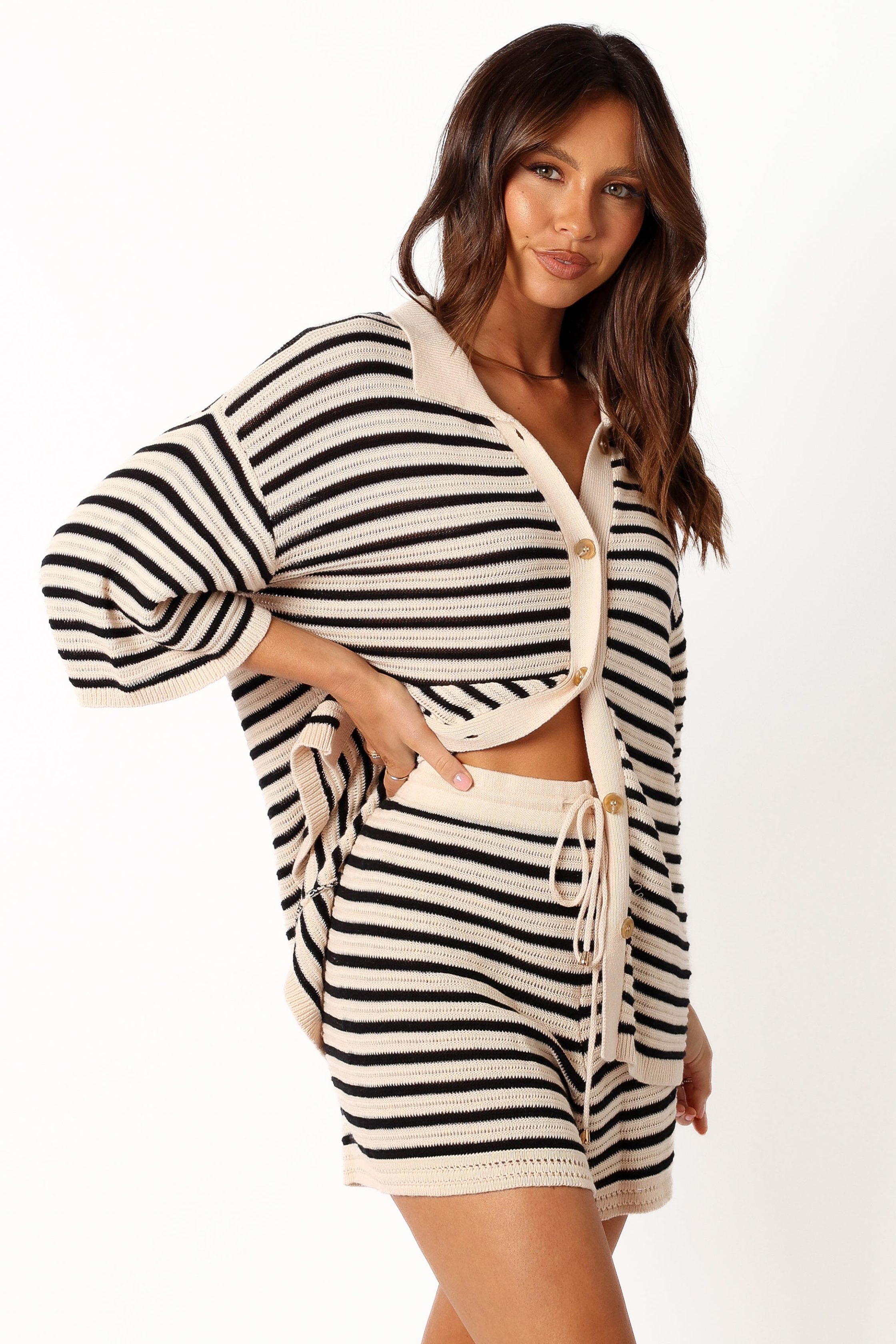 Dare to be effortlessly chic with our 'Cherie Knit Shirt' in sand/black. Its button-down design, V-neckline, and short sleeves make it a stylish must-have for your wardrobe. With a sleek spread collar and a trendy stripe pattern, this shirt serves up some serious fashion vibes. button down knit shirt spread collar v neckline short sleeves stripe pattern design unlined material – 100% cotton SIZING model is 5' 6" and wears a Size S model stats: bust – 31", waist – 23", hips – 34" GARMENT CARE cold hand wash separately