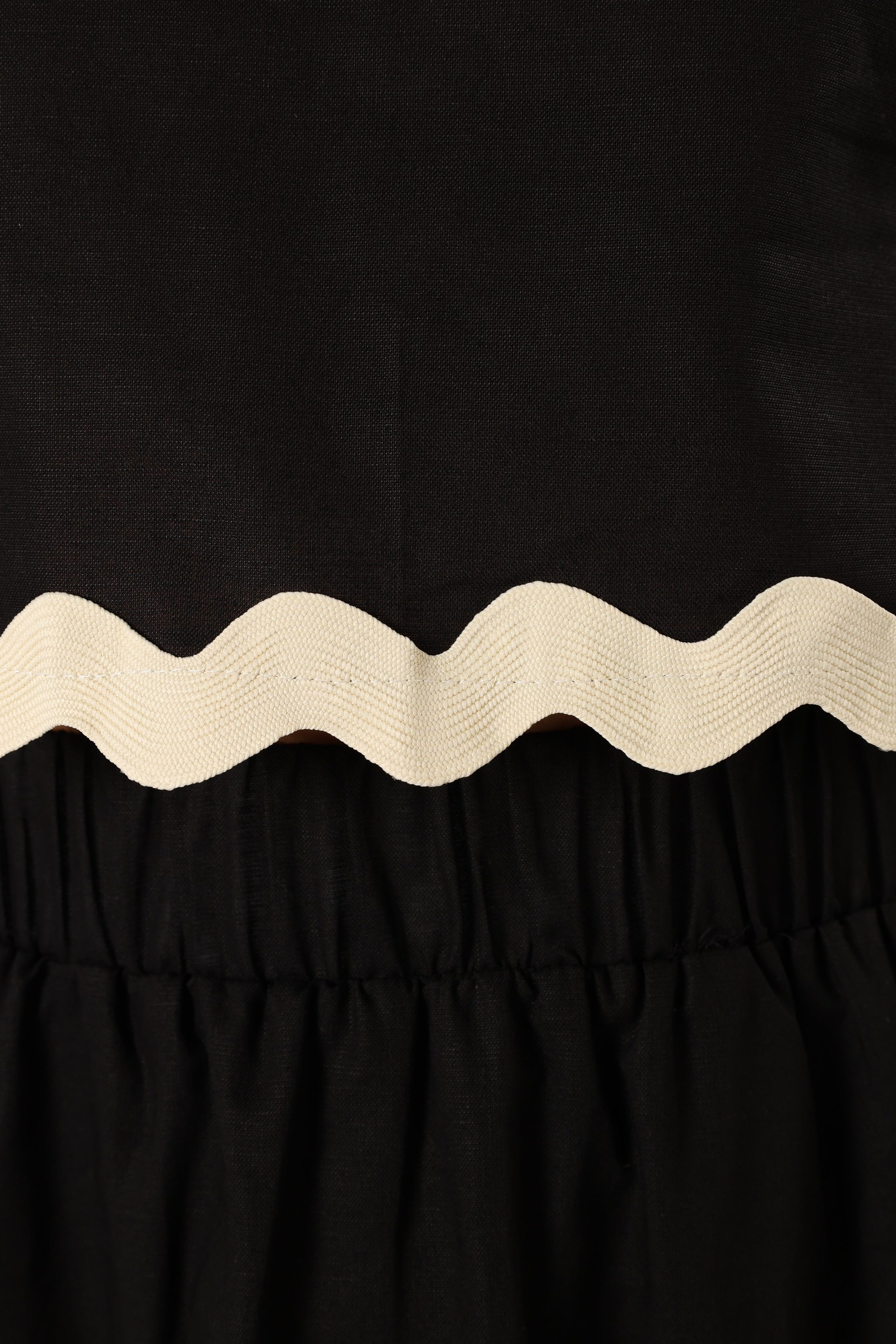 Make a statement with our vibrant Chrissy Two Piece Set in Black Cream. This classic combo features a chic cropped top with a demure round neckline and back neck opening. The set's elegant midi length skirt sits high on the waist and gently flares into a classic A-line silhouette, enhanced by an elasticised waistband for your ultimate comfort top and skirt set cropped length round neckline back neck opening with button close invisible side zip midi length skirt high waisted style elasticised waist band a-line skirt design ric rac trim detail top unlined / skirt lined material – 100% cotton SIZING model is 5' 8" and wears a Size XS model stats: bust – 30.5", waist – 24", hips – 36.5" GARMENT CARE cold hand wash separately
