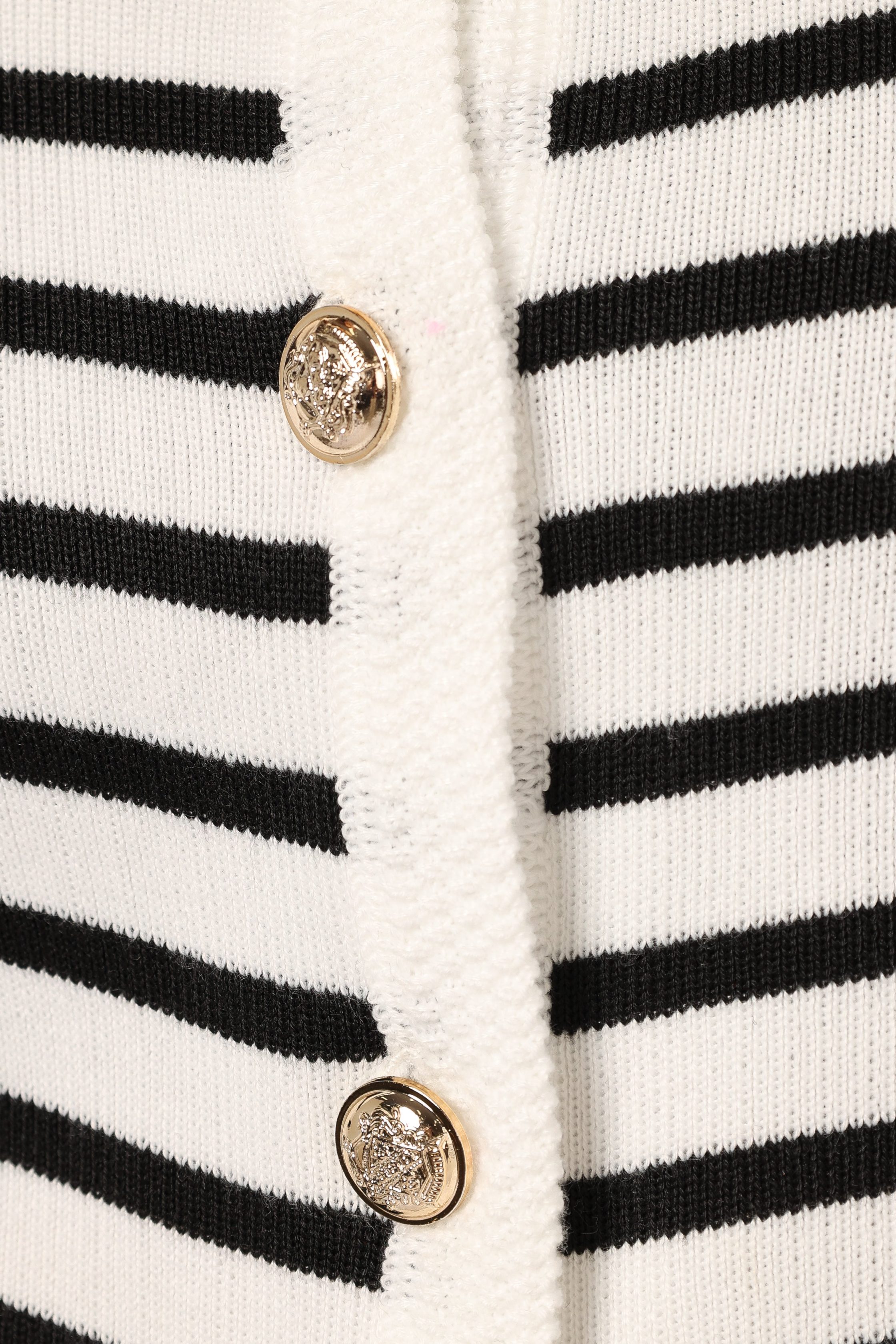 Designed with a flattering cropped length, this cardigan beautifully complements high-waisted skirts and trousers, adding a touch of elegance to your ensemble. The round neckline offers a versatile look that can be dressed up or down, making it perfect for various occasions. cropped length round neckline long sleeves functional gold buttons down front black and white stripe design unlined material – 95% polyester / 5% elastane SIZING studio model is 5' 7" and wears a Size S model stats: bust – 33", waist – 26", hips – 38" GARMENT CARE cold hand wash