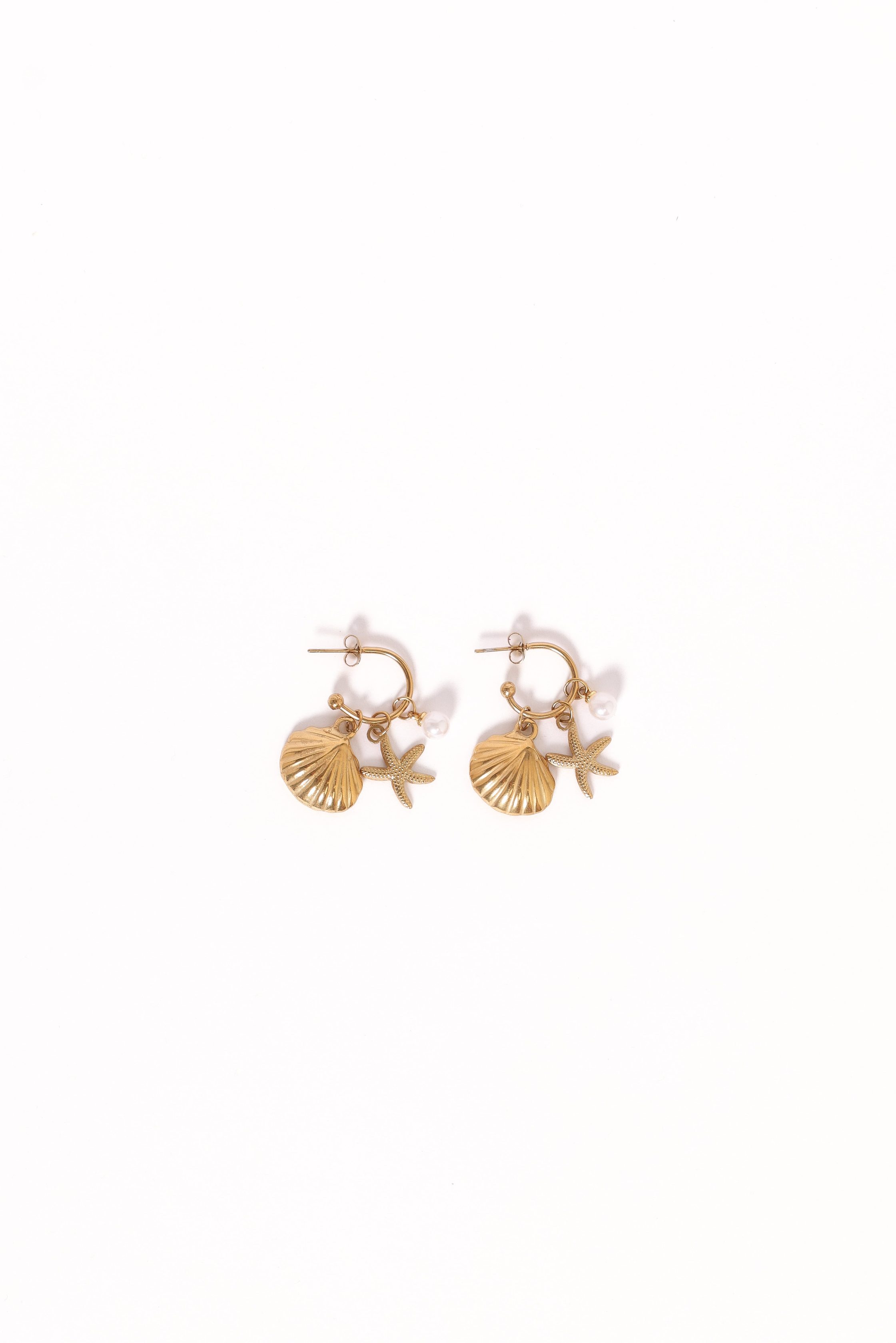 DETAILS Elevate your accessorising game with the Cypress Earrings in Gold, perfect for adding a touch of sophistication to any outfit. These drop-style hoop earrings feature a delicate starfish and faux pearl detail that exudes timeless elegance. drop style hoop earrings faux pearl detail star fish and shell pendants g