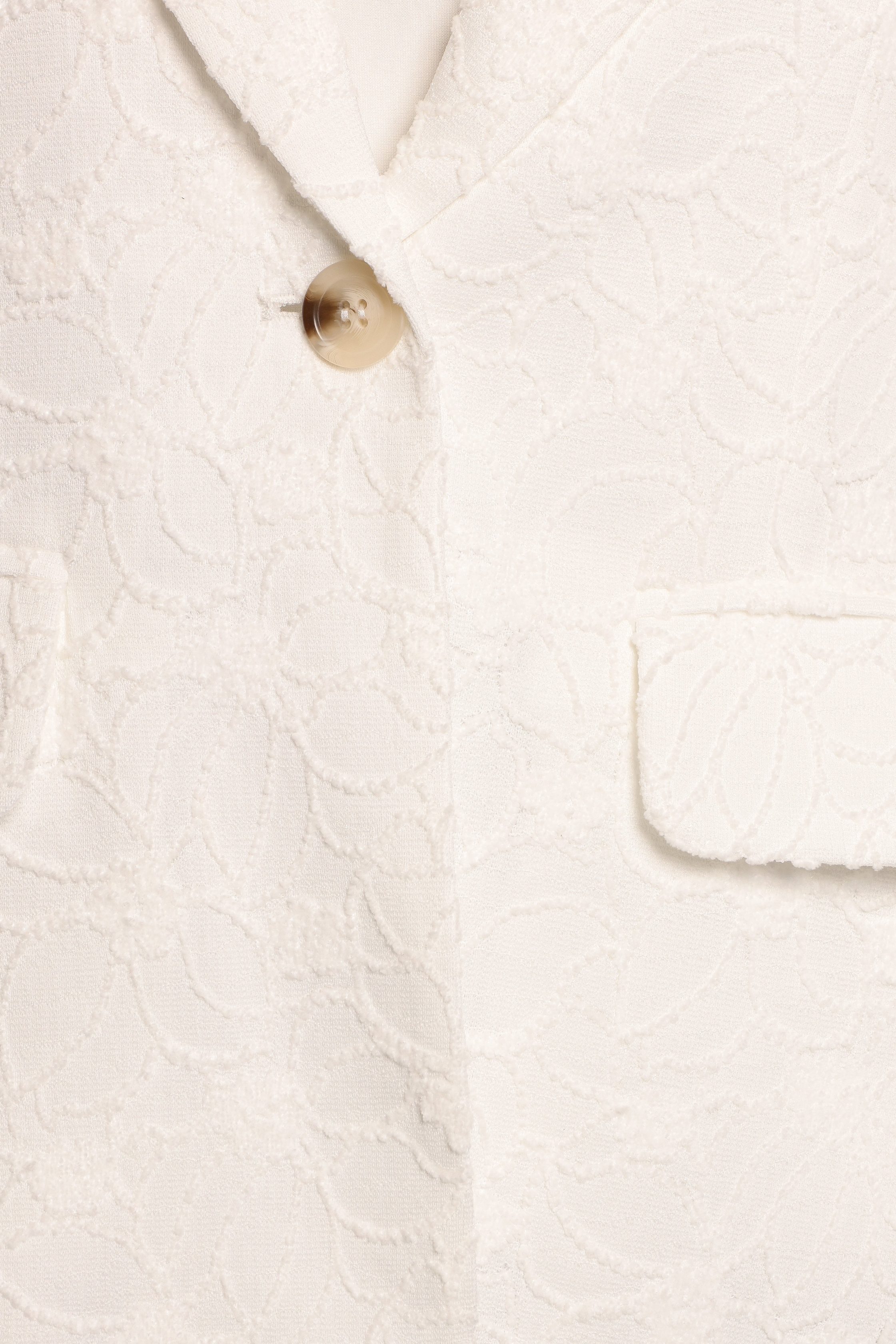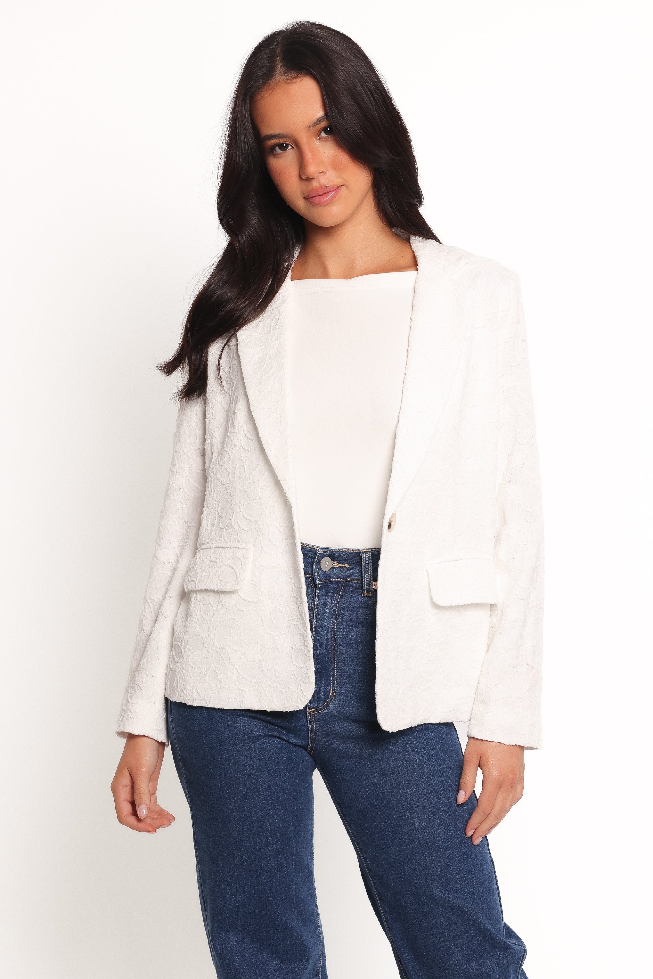 Effortlessly chic and endlessly versatile, the Darian Lace Knit Single Button Blazer in Off White is your go-to piece for upgrading any outfit. Designed with a sleek notch lapel and a flattering v-neckline, this blazer brings a tailored edge to your look without sacrificing comfort. notch lapel detail v neckline long sleeves single functional button close functional pockets textured floral print design lined – 96% polyester / 4% spandex material – 97% polyester / 3% spandex SIZING studio model is 5' 6" and wears a Size XS model stats: bust – 34", waist – 24", hips – 35" GARMENT CARE cold hand wash separately