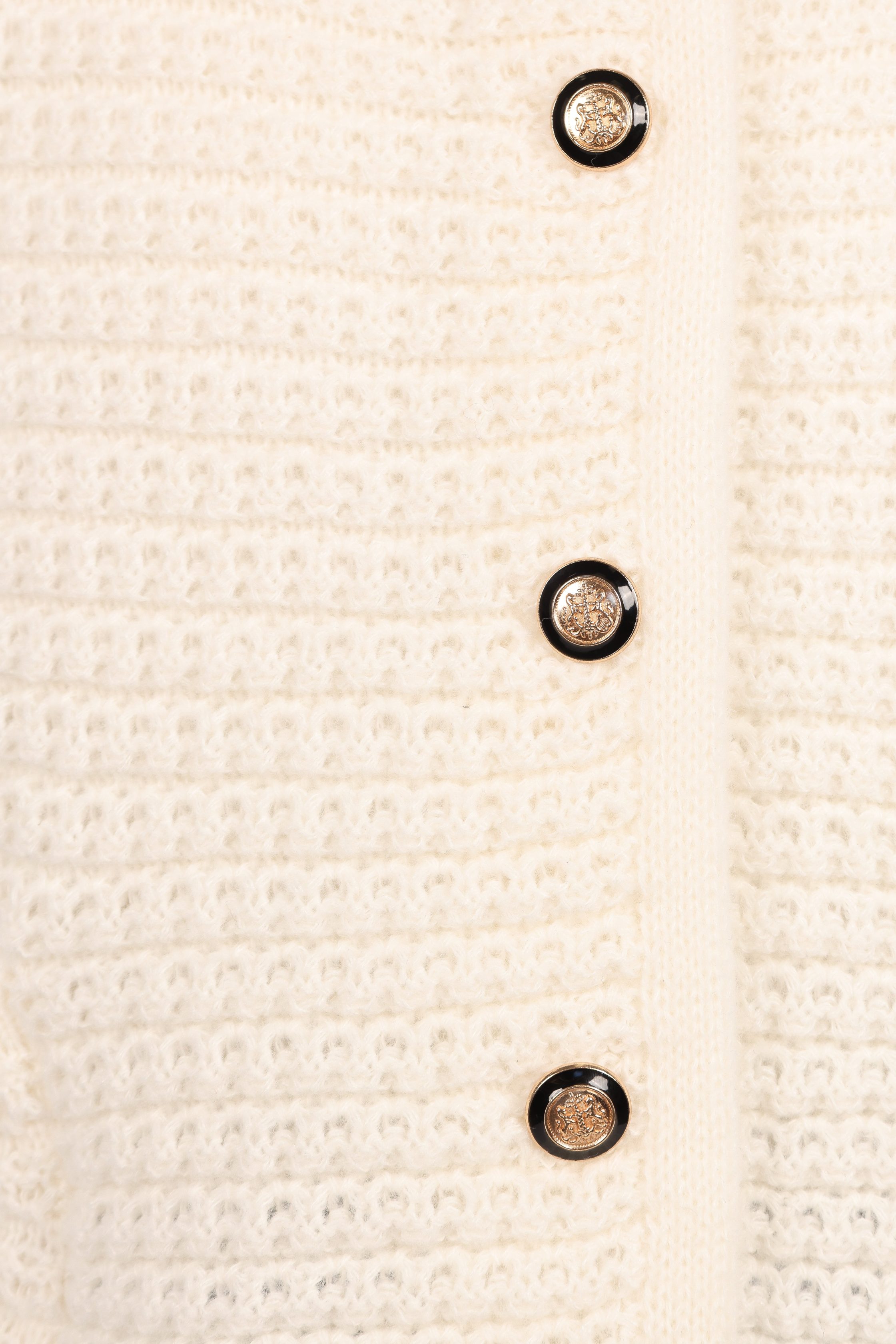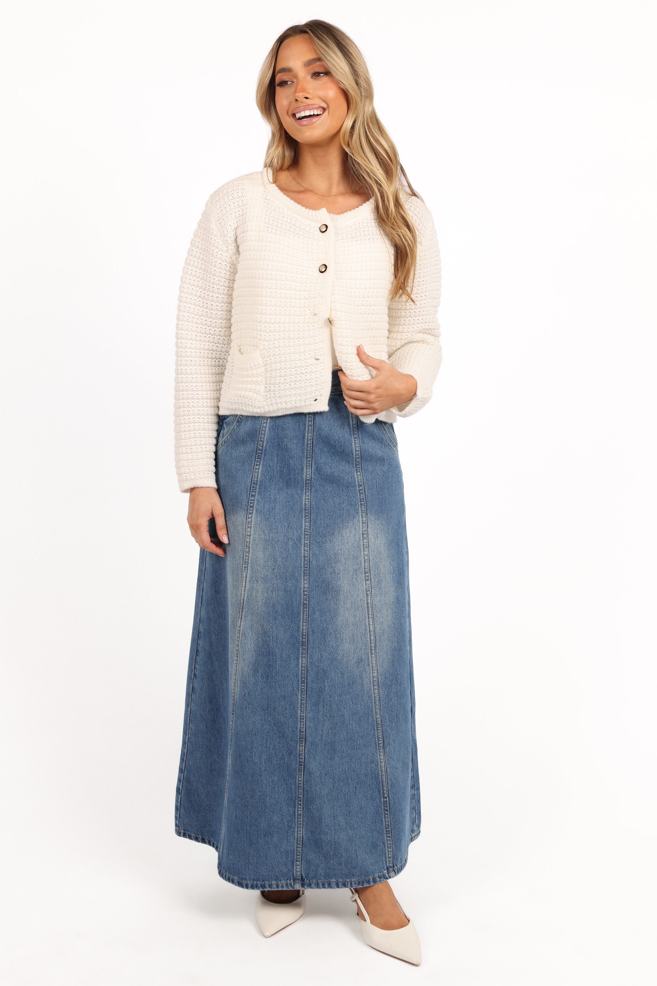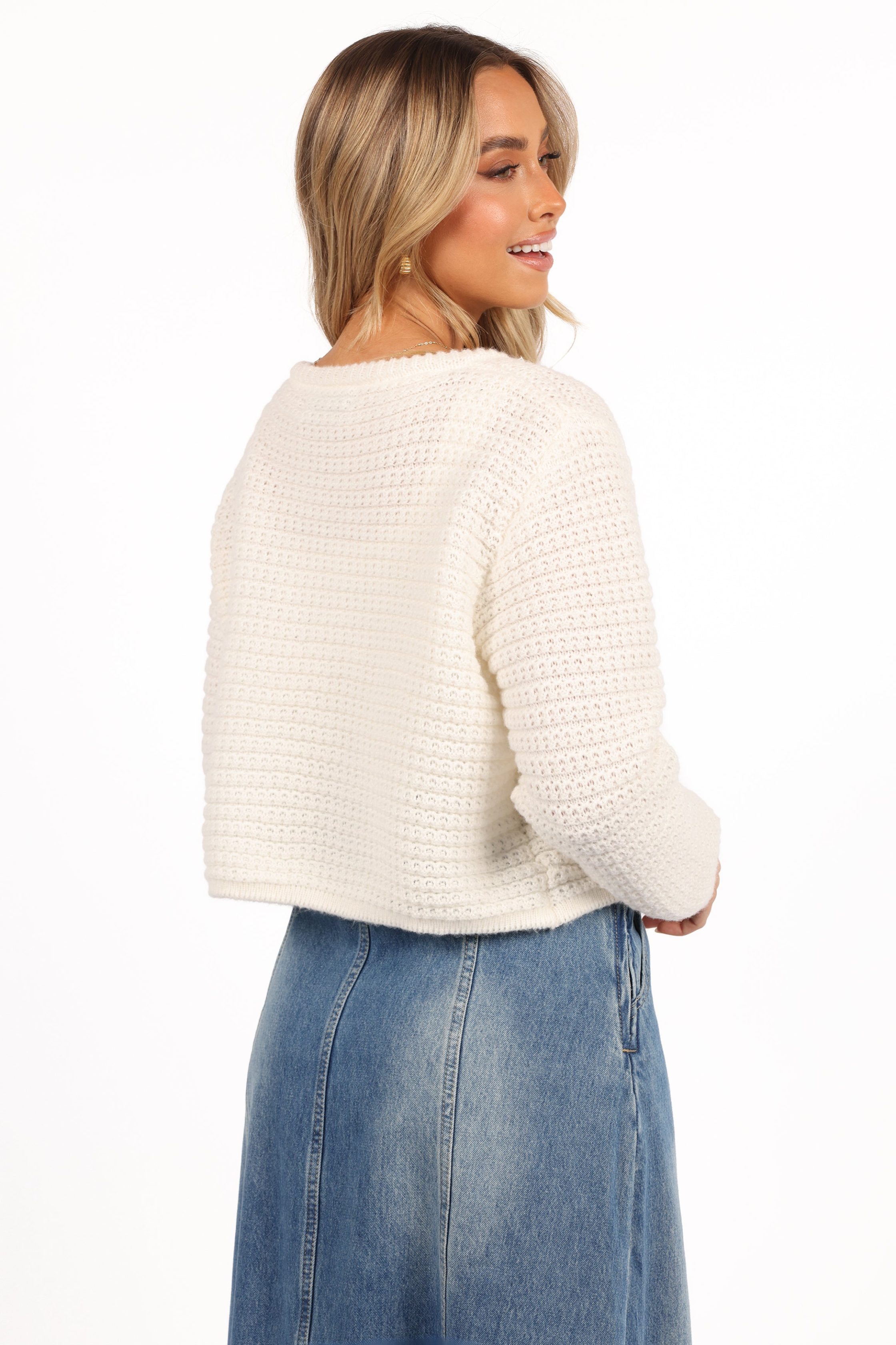 This cozy knit cardigan features a classic round neckline and long sleeves with ribbed cuffs. Perfect for pairing with your favourite jeans or skirt, it's an eye-catching piece that you'll reach for time and time again. round neckline long sleeves with ribbed cuffs functional gold buttons down front front functional pockets cropped design crochet textured feel unlined material – 85% acrylic / 15% wool SIZING model is 5' 5" and wears a size S/M model stats: bust – 31.5", waist – 25.5", hips – 37" GARMENT CARE I'm delicate ♡ cold hand wash separately