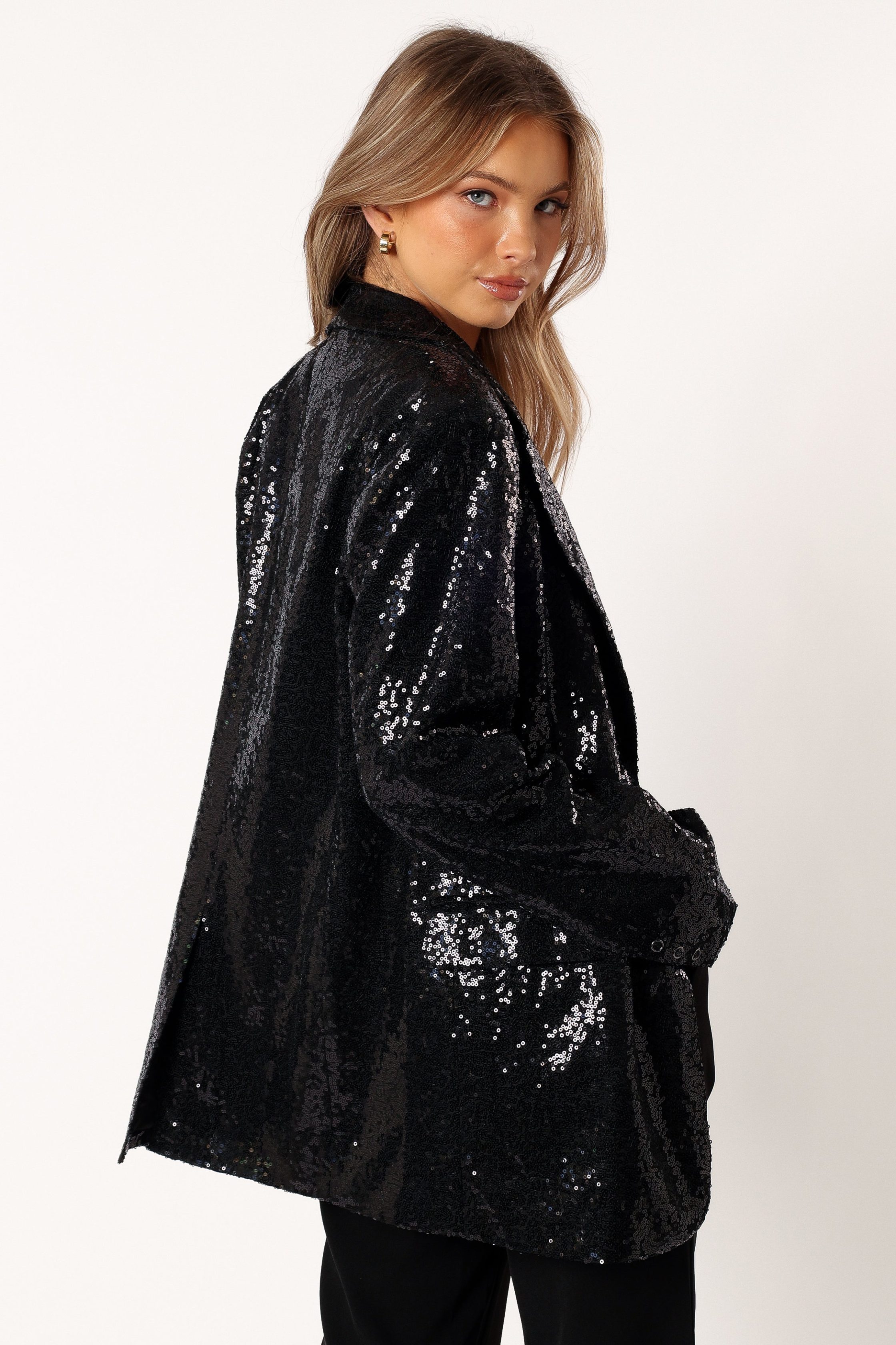 It's time to get glitzy and glamorous with our new relaxed sequin blazer! This sparkling piece of outerwear features a classic lapel collar, long sleeves that can be buttoned closed, shoulder pads, and one button close. relaxed style sequin blazer collared with lapel long sleeves with button close shoulder pads one button close non functional front pockets back split detail lined material – 100% polyester lining – 95% polyester / 5% spandex SIZING model is 5' 7" and wears a Size XS model stats: bust – 30", waist – 24", hips – 35" GARMENT CARE cold hand wash separately