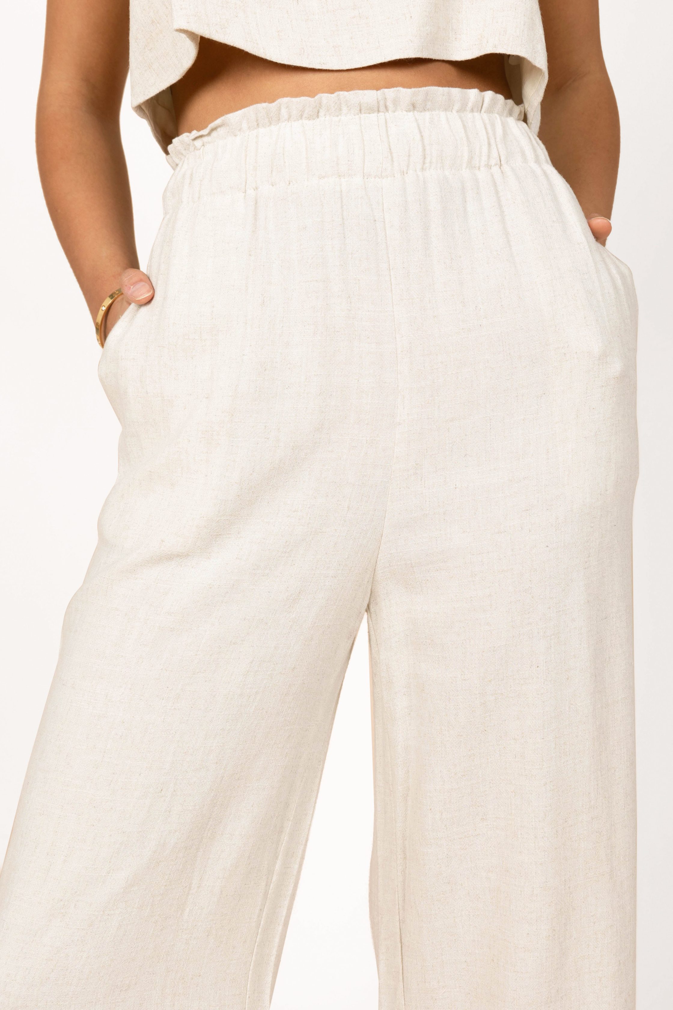 Discover easy-to-style comfort with our new wide leg pants! With a high waisted fit and an elasticised waist band, you'll be feeling fabulous all day long. The relaxed fit makes them easy to wear for any occasion, while the functional pockets mean you can keep your essentials close at hand. wide leg style high waisted elasticised waist band functional pockets relaxed fit unlined material – 100% linen SIZING model is 5' 8" and wears a Size XS model stats: bust – 79cm, waist – 24.5", hips – 36" GARMENT CARE cold hand wash separately