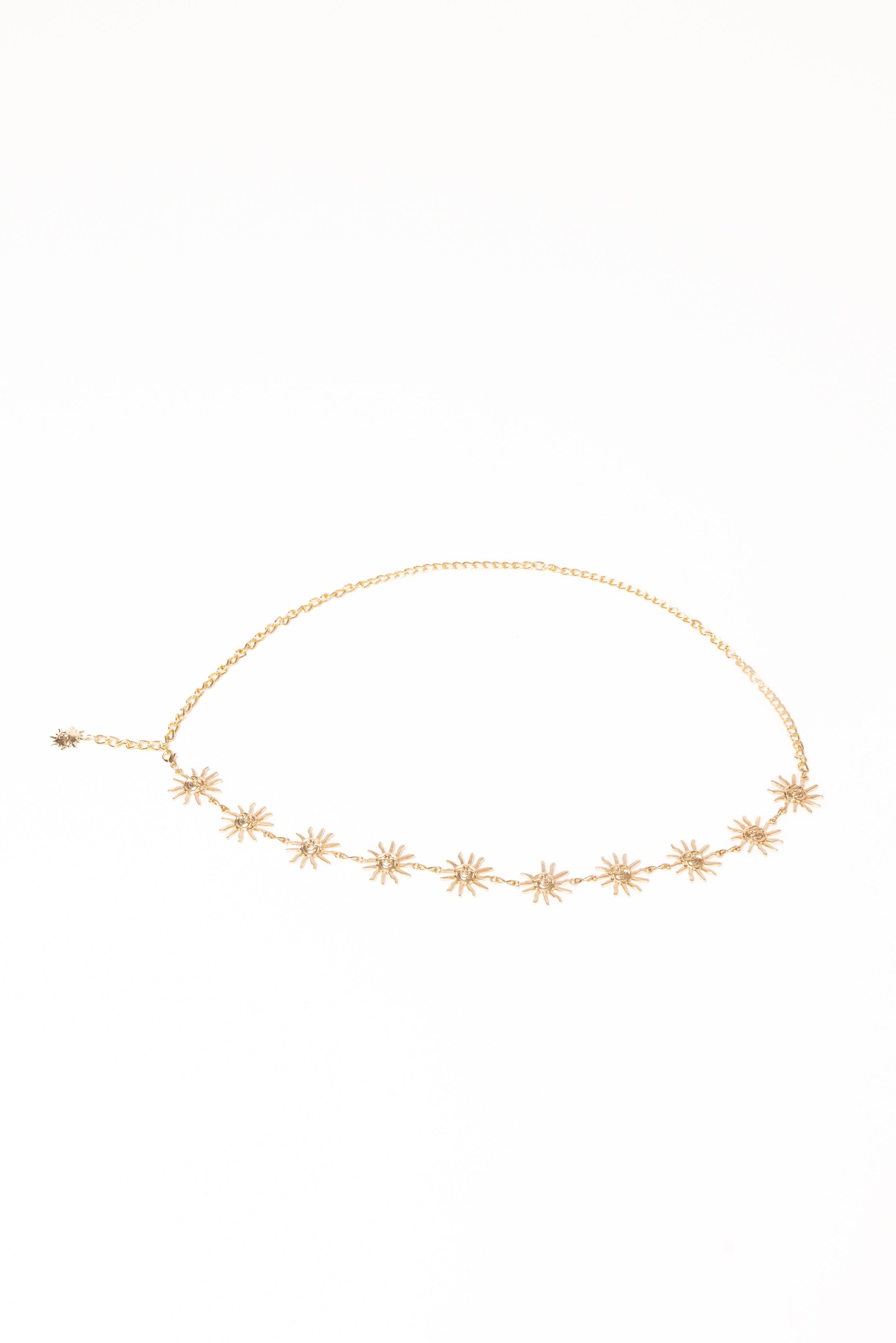 DETAILS Add a touch of glamour to any outfit with the Emmeline Belt – Gold. Featuring a modern chain design and a striking sun pendant, this accessory is as bold as it is beautiful. chain design sun pendant detail gold hardware lobster clasp closure material – 100% alloy MEASUREMENTS length – 38"
