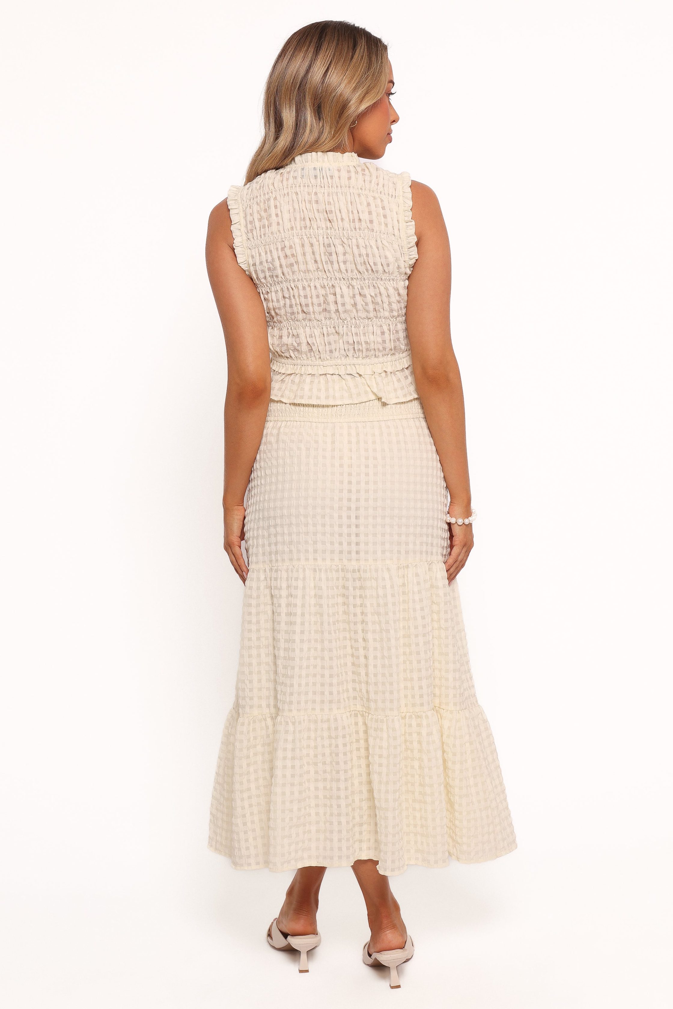 DETAILS Add a touch of effortless charm to your wardrobe with the Farica Gingham Midi Skirt in Cream. This staple piece is designed with versatility and comfort in mind, featuring a classic gingham print that feels timeless yet fresh. midi length elasticised shirred waist band drop tiered a-line skirt design gingham pr