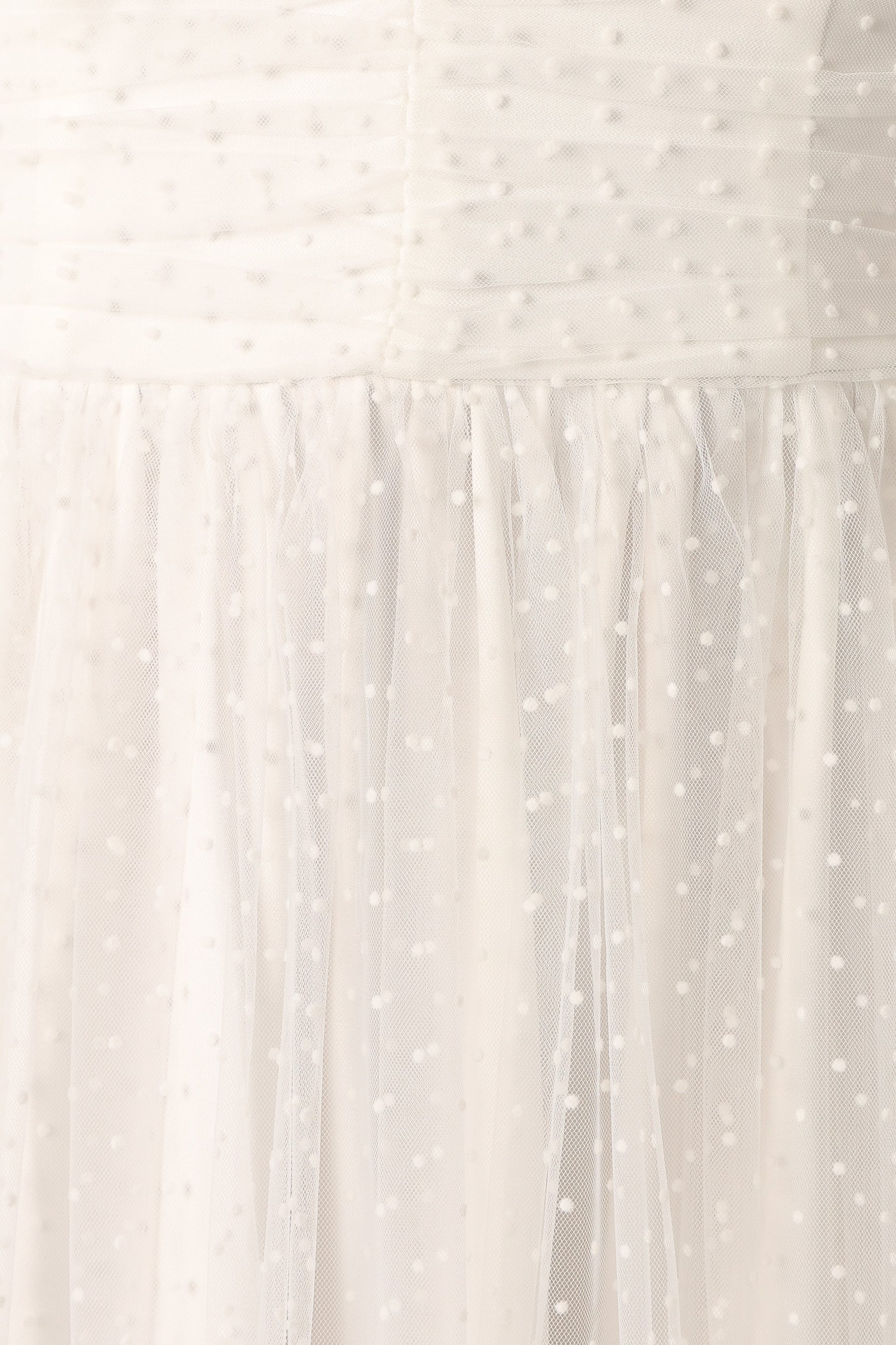 Make a statement in this dreamy dress! This midi dress features a sweetheart neckline, tie close shoulder straps, and padded cups in the bust for extra support and to top it all off, this dress is made with a white polka dot tulle overlay for an elegant touch. Perfect for any special occasion. midi length sweet heart neckline tie close shoulder straps padded cups in bust front gathered detail on bodice inner bust rubber grip back silver zip with hook and eye clasp shirred back panel ruffle detail on hemline white polka dot tulle overlay tulle hemline lining lined material – 100% nylon contrast – 100% polyester lining – 100% polyester SIZING Studio model is 5' 8" and wears a Size XS model stats: bust – 30.5", waist – 24", hips – 36.5" Modern Romance Campaign Grace is 5' 5" and wears a Size XS model stats: bust – 31.5", waist – 25.5", hips – 37" GARMENT CARE cold hand wash separately