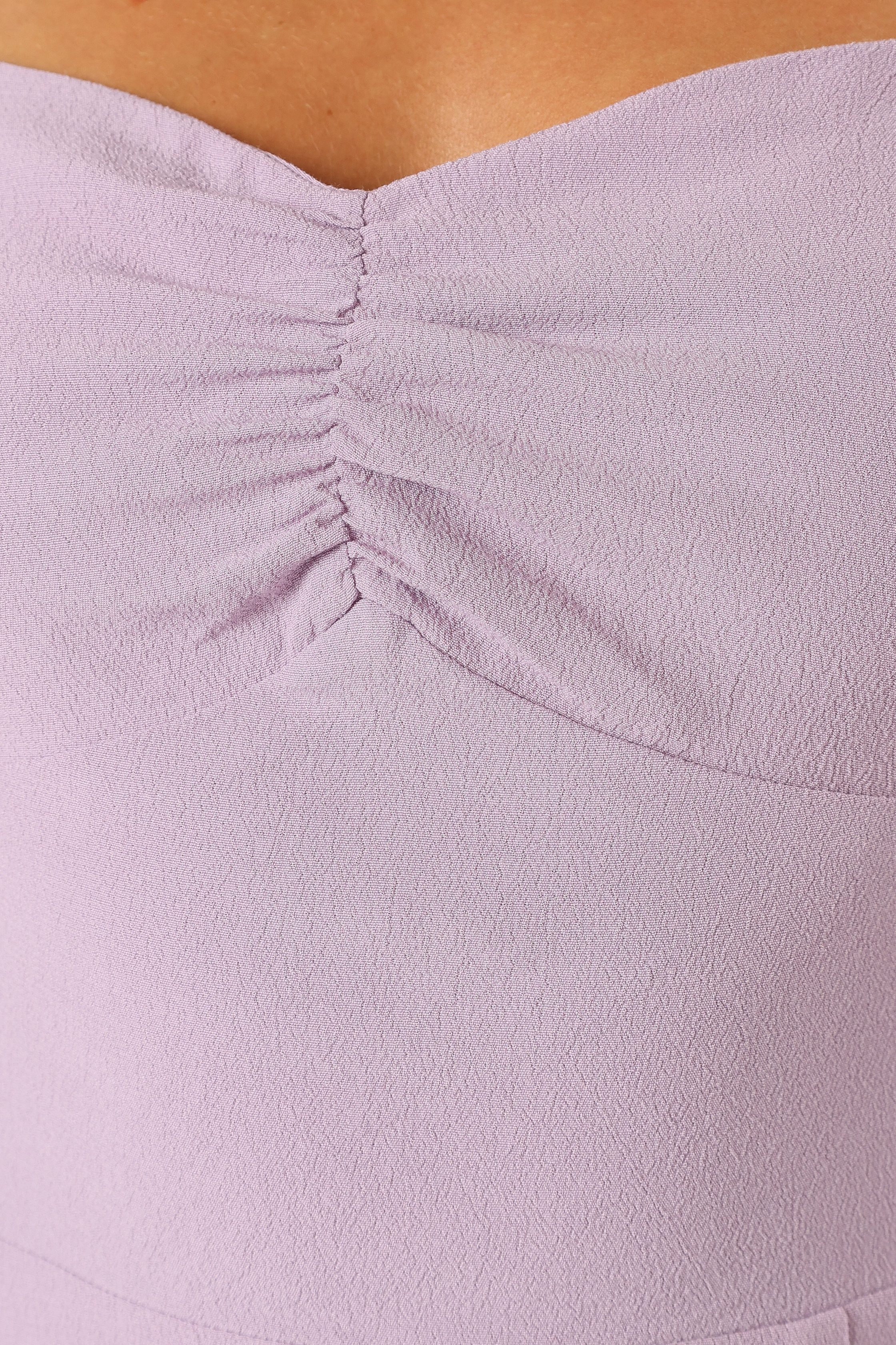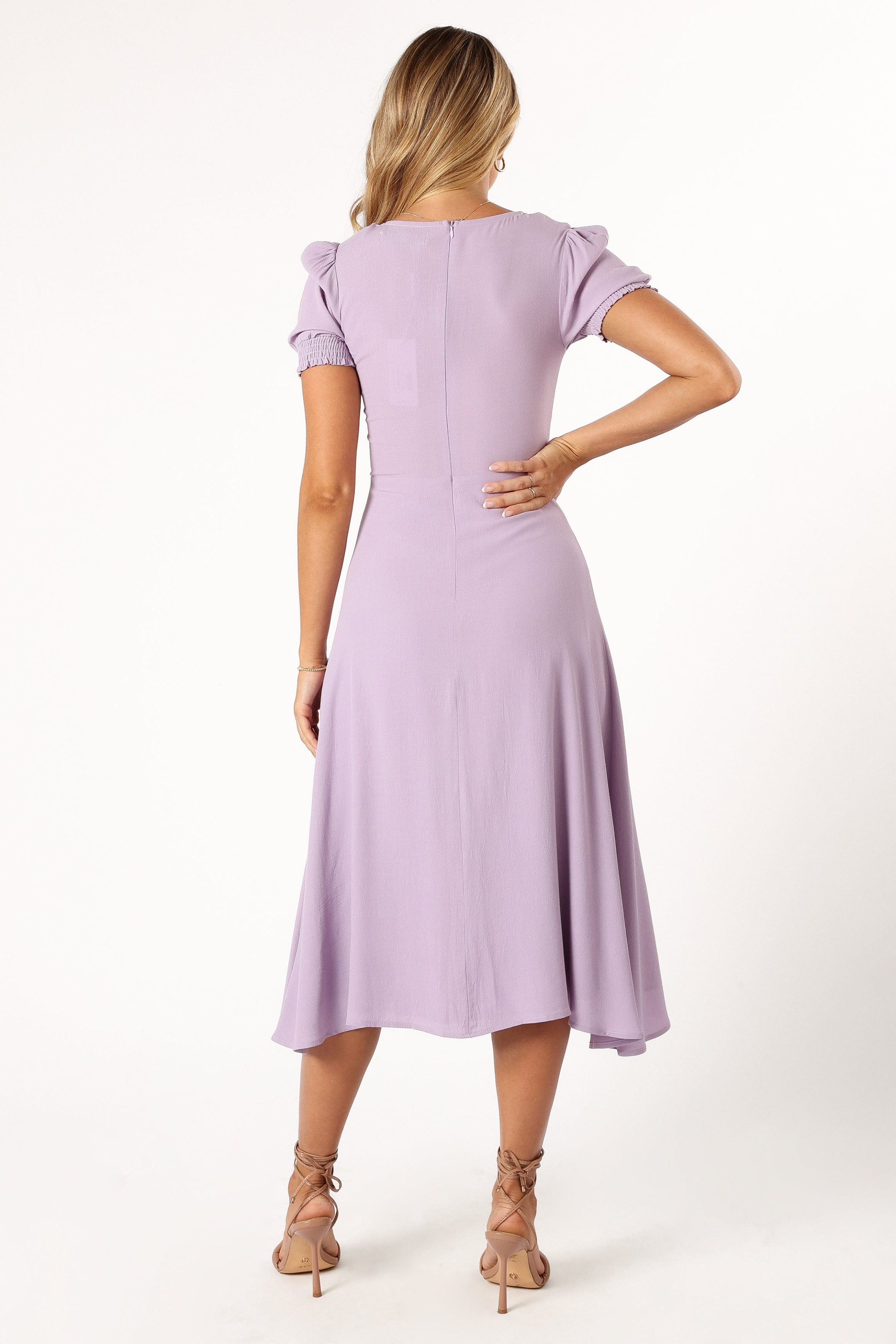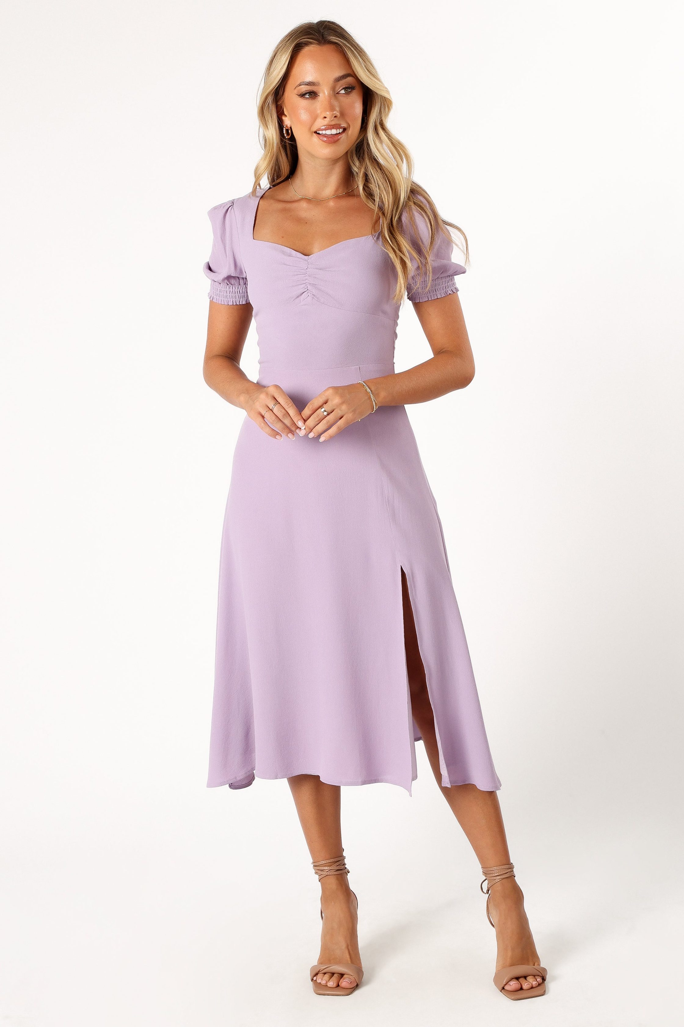 This midi dress is a timeless classic with its shirred cuffs and sweetheart neckline. The ruched bust detailing adds an elegant touch, while the front split gives you a bit of extra movement for maximum comfort. midi length short sleeves with shirred cuff sweetheart neckline ruched bust detailing front split invisible back zip top unlined / skirt lined material – 50% rayon / 50% viscose lining – 100% polyester SIZING model is 5' 5" and wears a Size 2 model stats: bust – 31.5", waist – 25.5", hips – 37" GARMENT CARE cold gentle machine wash