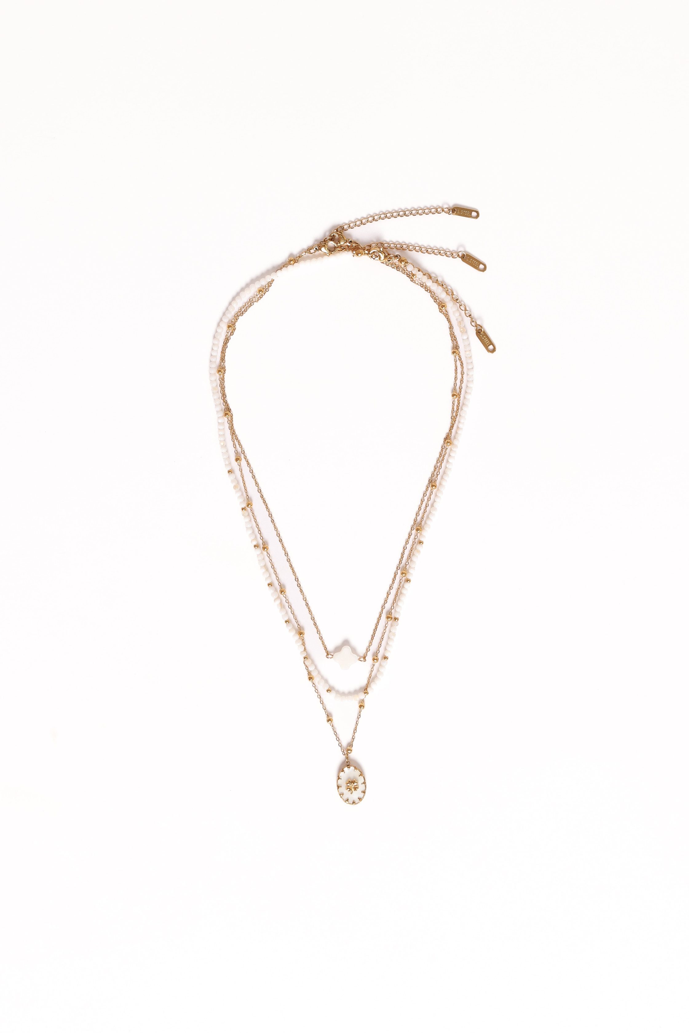DETAILS Elevate your accessories game with the Goldie Necklace in Gold/White, a stunning trio of layered perfection. Featuring fine chain styles adorned with delicate white bead details and chic shell pendants, this set offers a contemporary beach-inspired vibe that's versatile enough for every occasion. set of three