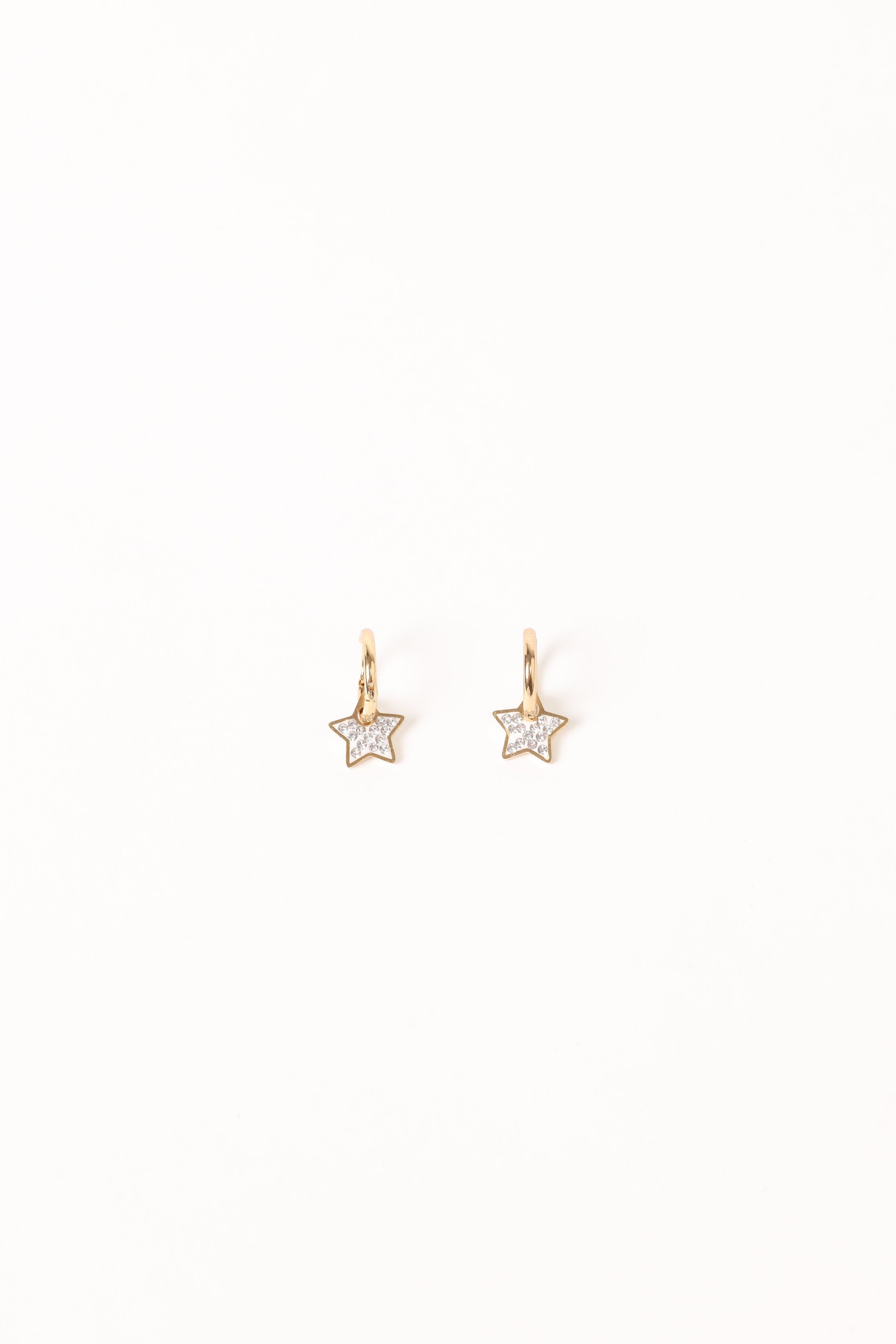 DETAILS Add a touch of celestial charm to your look with the Hayden Star Earrings in Gold. These hoop earrings feature a delicate crystal star drop design that catches the light with every movement, making them perfect for day-to-night styling. hoop style crystal star drop design gold hardware clasp closure material –