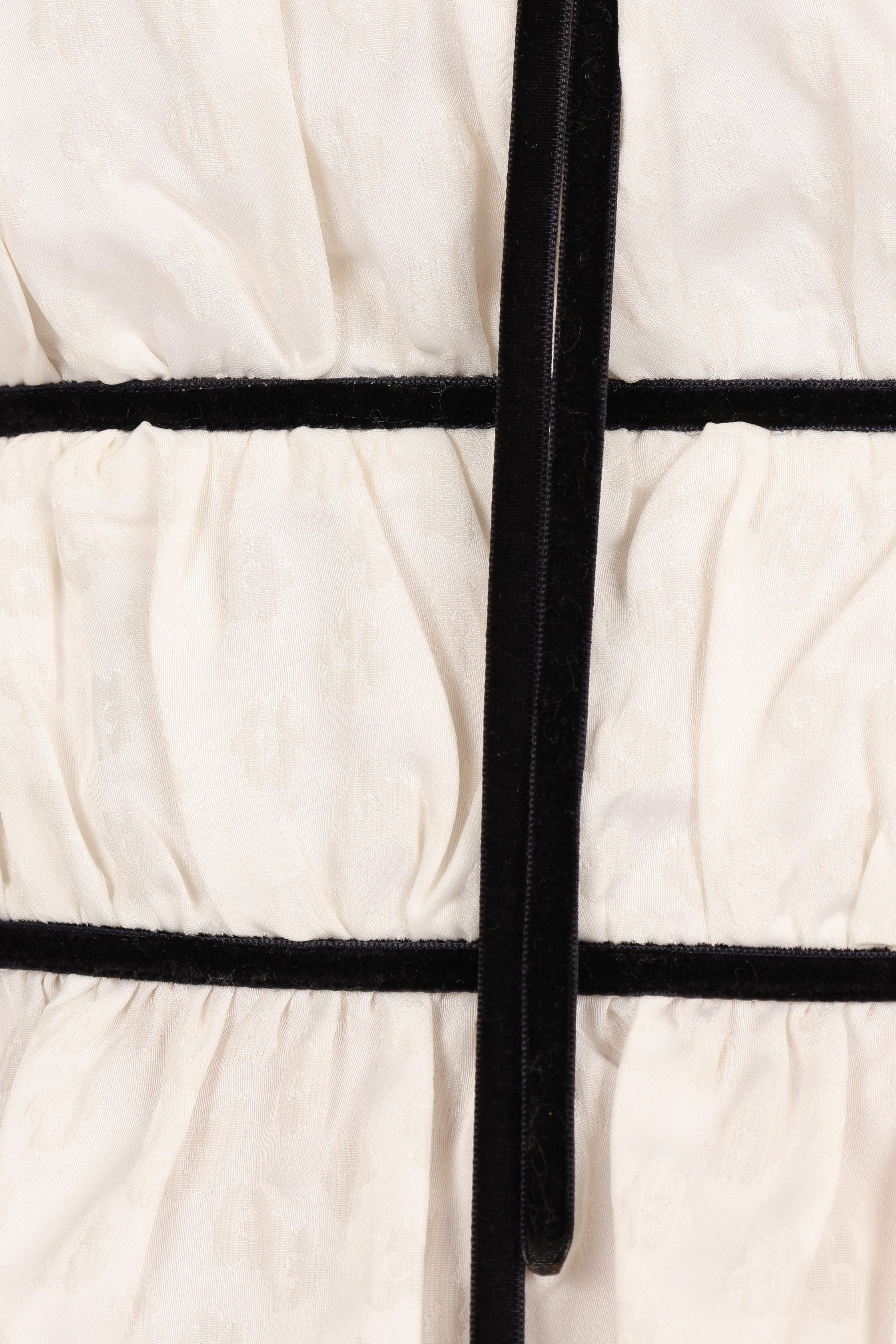 Featuring a cropped length that gracefully accentuates the waist, this top is designed for those who appreciate a mix of classic style with a modern twist. The square neckline and thin adjustable straps provide a timeless silhouette that flatters every figure, ensuring a comfortable and secure fit for all-day wear. cropped length square neckline thin adjustable straps invisible back zip with hook and eye clasp non functional tie on bust black velvet trim detail white floral print peplum style hemline lined material – 100% polyester lining – 100% polyester SIZING Studio model is 5' 8" and wears a Size XS model stats: bust – 30.5", waist – 24", hips – 36.5" GARMENT CARE cold hand wash separately