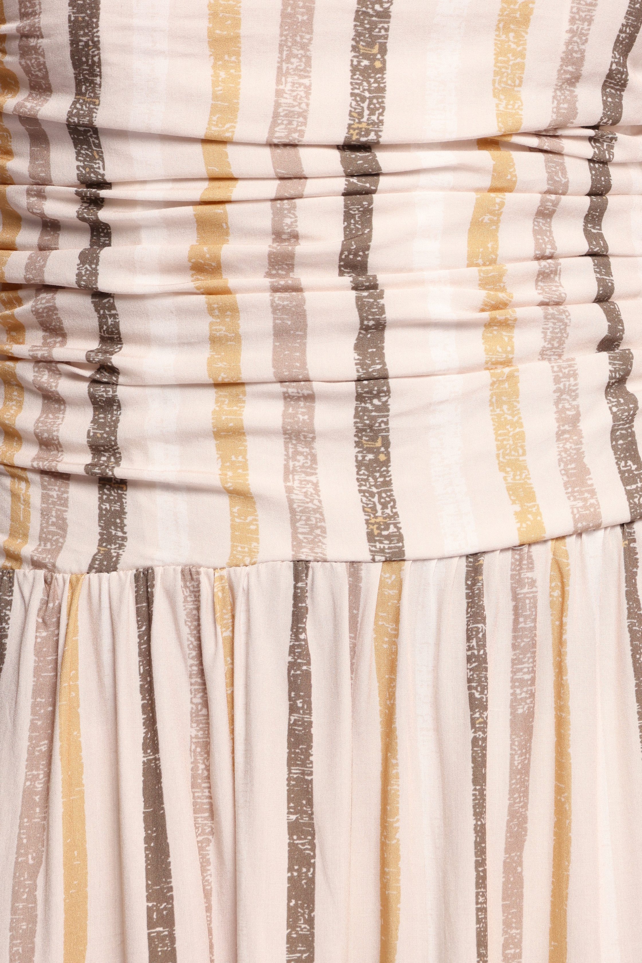 DETAILS Make an unforgettable statement with the Jimena Strapless Maxi Dress in Brown Stripe. The elongated maxi length and bold stripe print create an effortlessly chic silhouette, perfect for everything from sun-soaked brunches to evening soirees. maxi length strapless design straight neckline inner bust rubber grip