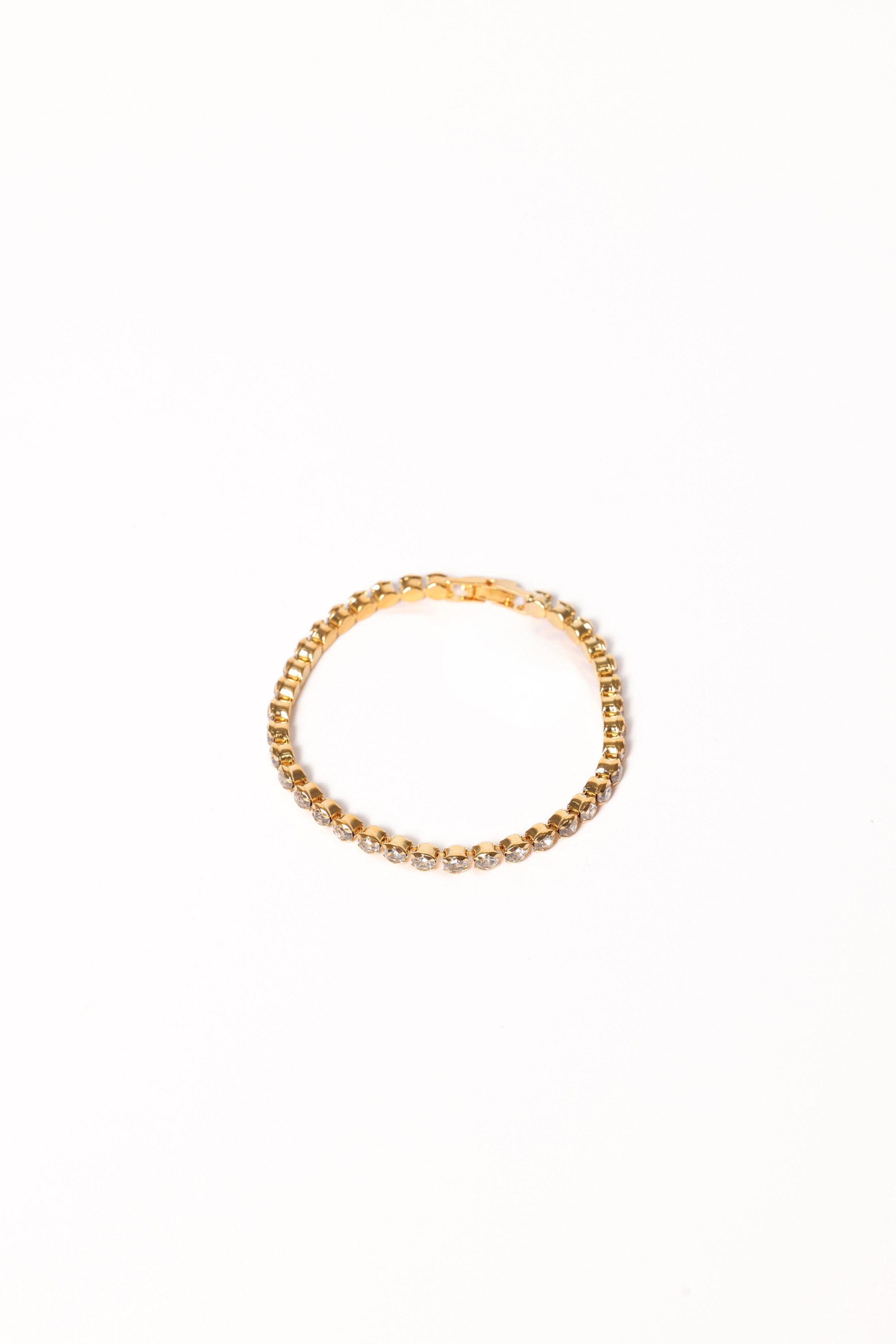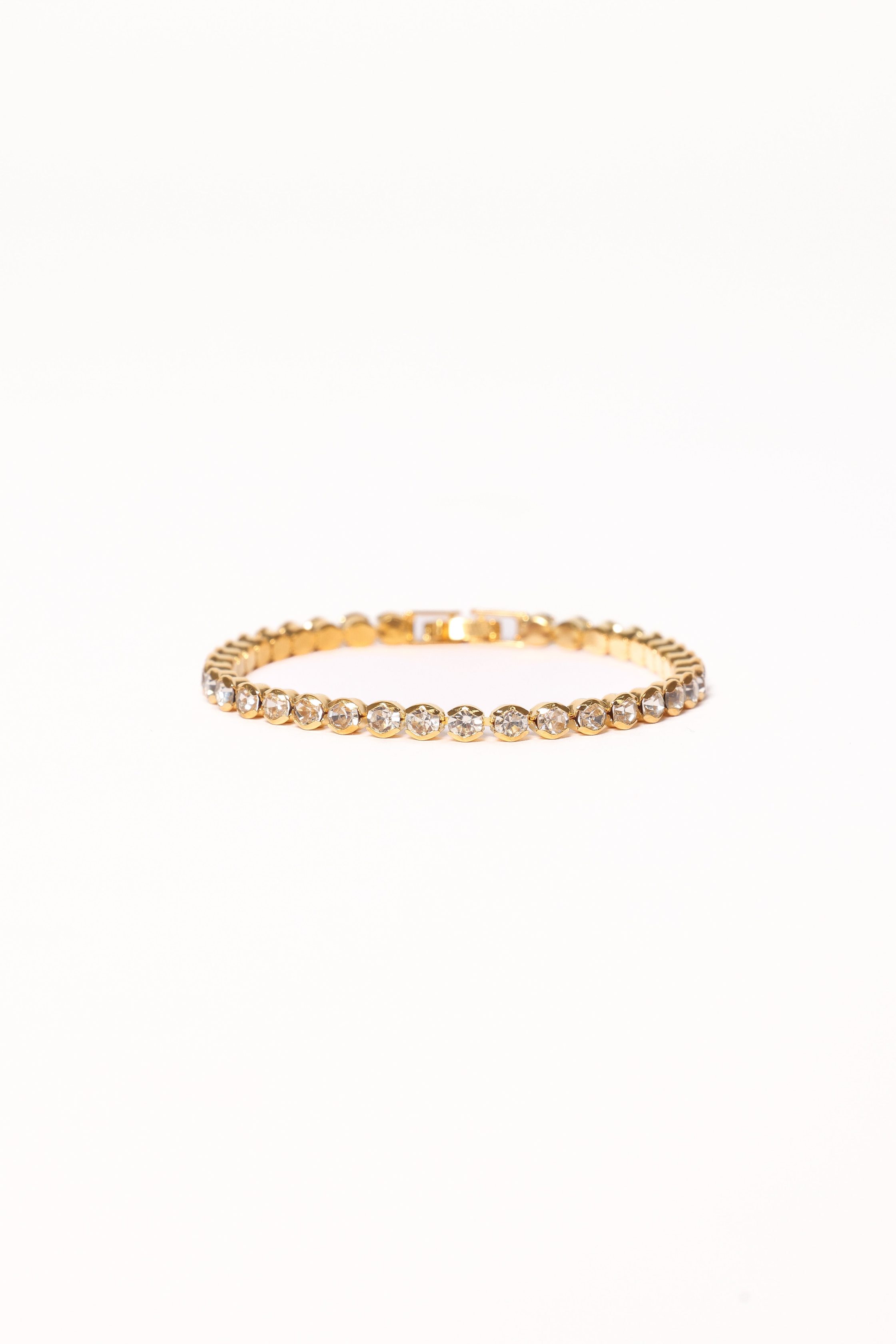 DETAILS Elevate your look with the Jules Bracelet in Gold, a timeless tennis bracelet reimagined for the modern trendsetter. Featuring shimmering crystals that catch the light with every move, this piece is designed to add the perfect hint of glam to your jewellery collection. tennis bracelet style embellished crystal