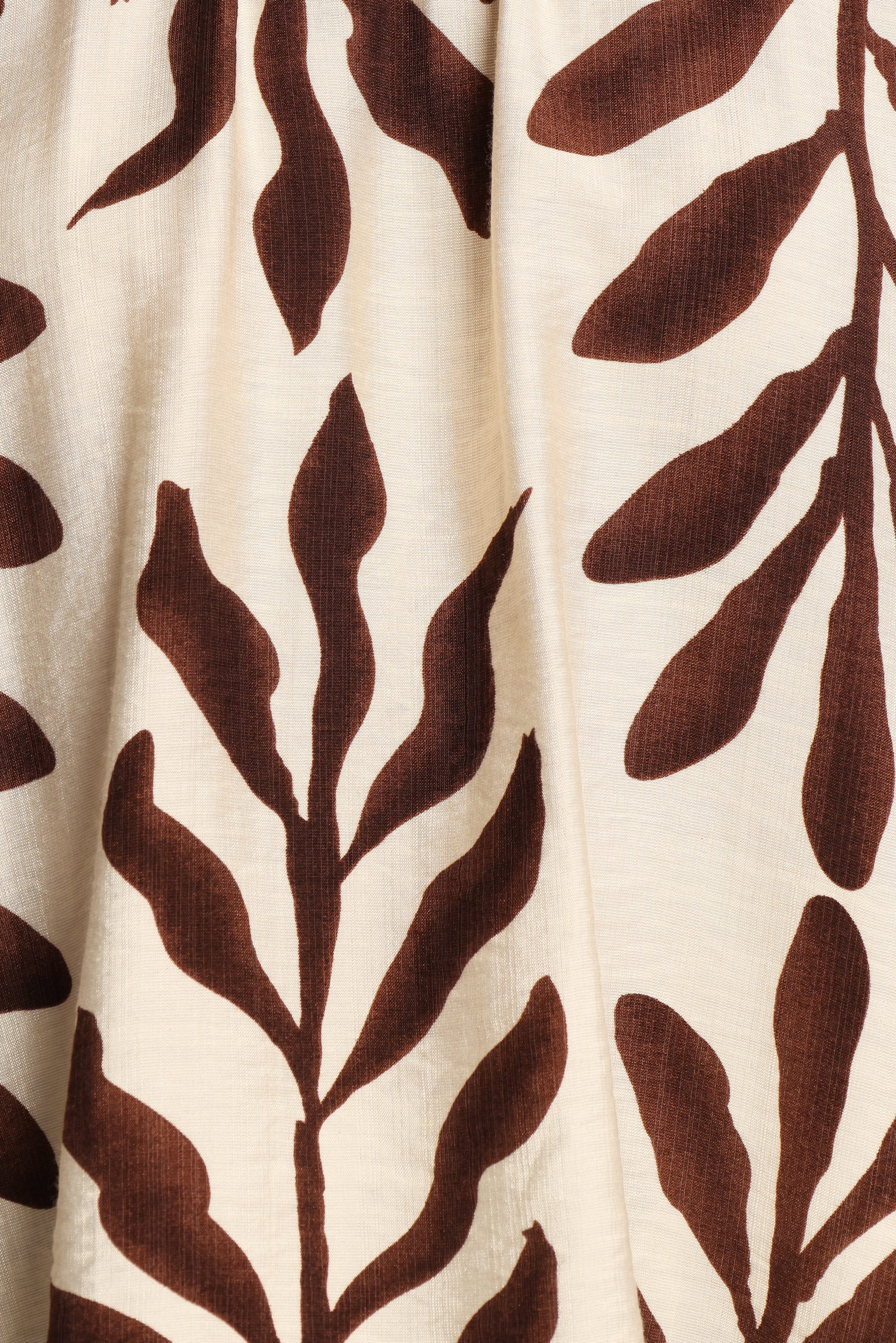 DETAILS Step out in style with the July Long Sleeve Smock Top in Brown Palm. With its effortlessly chic design, this top boasts a round neckline and breezy long sleeves finished with elasticised cuffs for a touch of casual elegance. round neckline long sleeves with elasticised cuffs brown palm print relaxed fit unlined