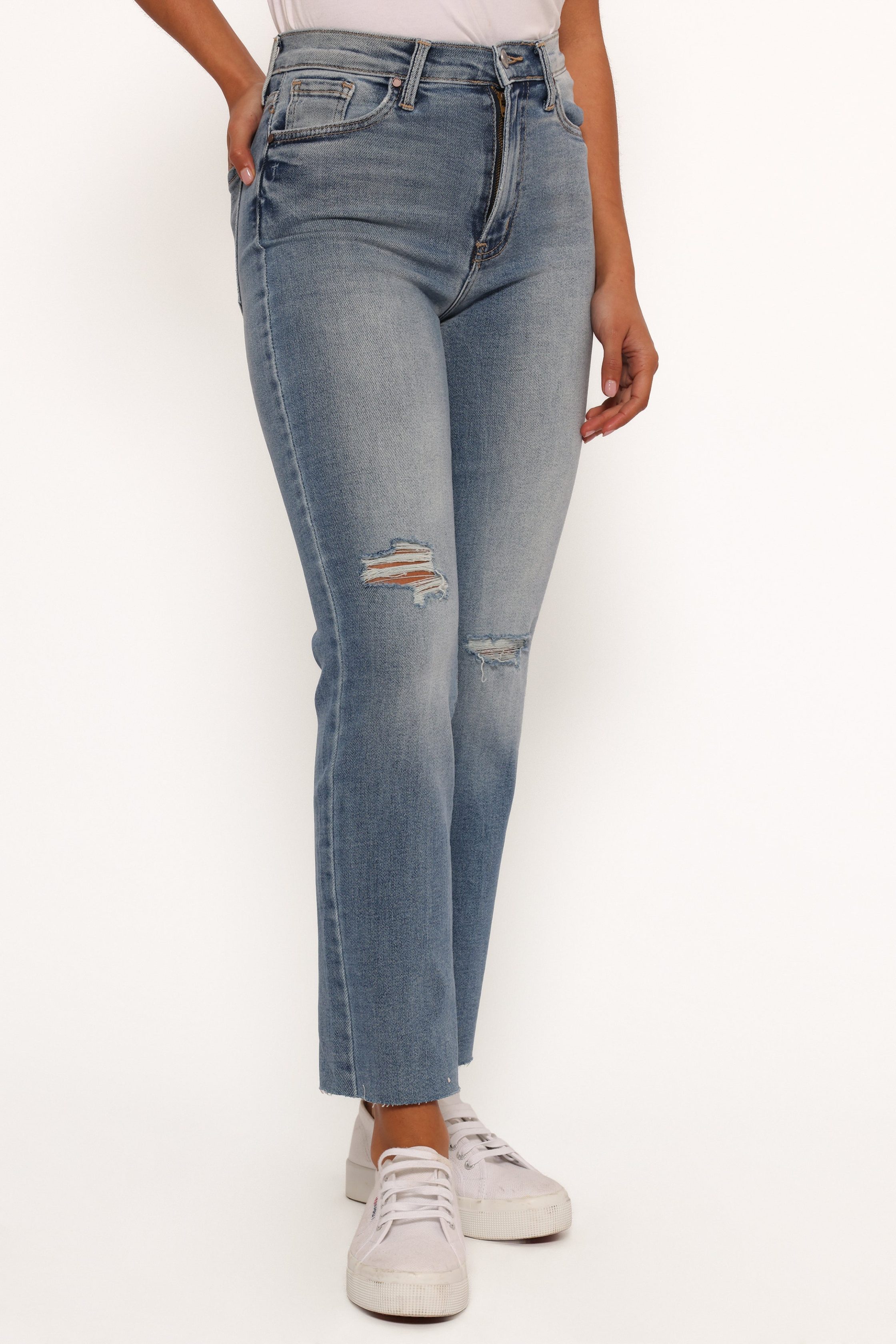 Step up your denim game with our high-waisted distressed jeans—a must-have for any fashion-forward wardrobe. Imagine slipping into a pair of jeans that hug your curves in all the right places, giving you that instant confidence boost. high waisted straight slim leg belt loops zip and button close functional pockets distressed feature mid stretch raw hem unlined material – 93% cotton / 5% polyester / 2% spandex SIZING studio model is 5' 8" and wears a size 25 model stats: bust – 31", waist – 24", hips – 35" GARMENT CARE cold gentle machine wash