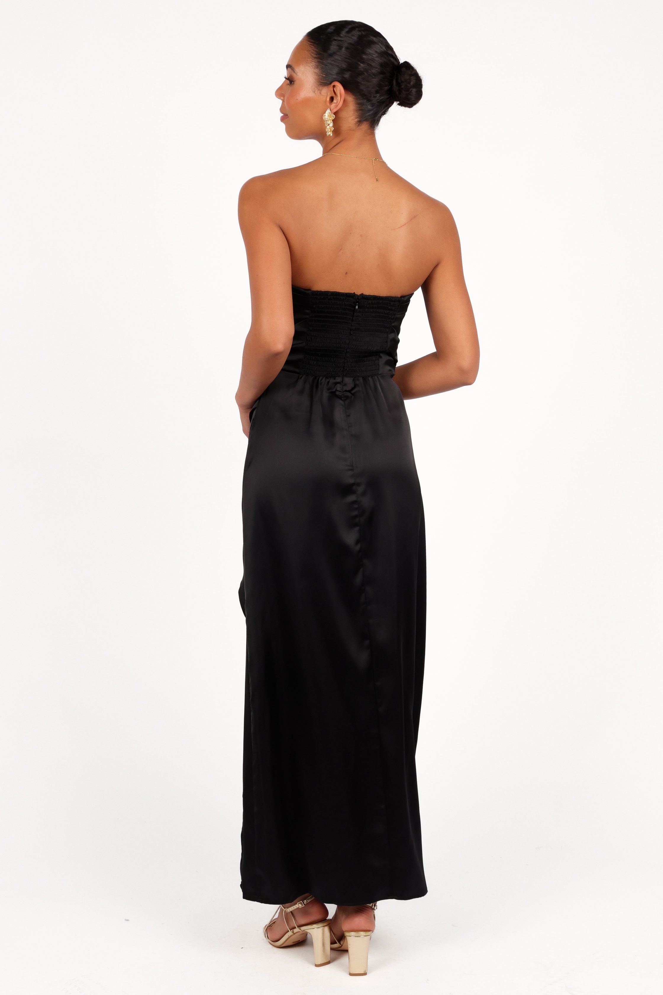 This dress is an ideal choice for any formal event, from weddings to galas or even a black-tie affair. Pair it with statement earrings and strappy heels for a glamorous look that exudes confidence and elegance. strapless design maxi length straight neckline pleat feature on bust back shirred panel invisible back zip front split detail satin sheen finish partially lined material – 93% polyester / 7% spandex SIZING Studio model is 5' 10" and wears a Size S model stats: bust – 32", waist – 24.5", hips – 35" Modern Romance Campaign Melita is 5' 8" and wears a Size S model stats: bust – 36", waist – 25", hips – 36" Paris is 5' 10" and wears a Size XL model stats: bust – 40", waist – 33", hips – 48" GARMENT CARE cold hand wash separately