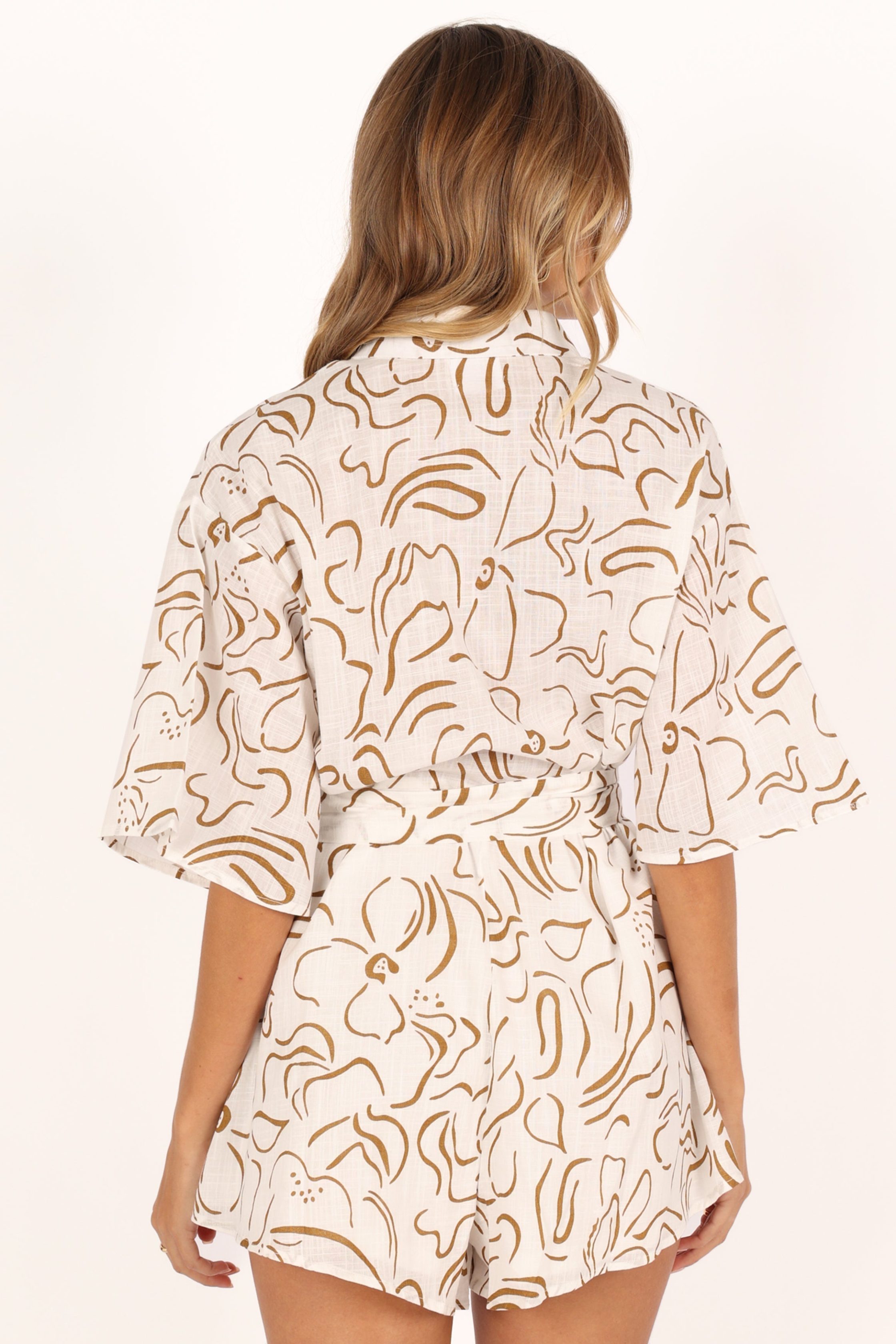 Discover the ultimate blend of comfort and style with this stunning, abstract print romper. This chic piece is perfect for a stylish summer, featuring a flattering V-neckline that visually elongates the neck and highlights your collarbone. spread collar v neckline short sleeves front functional button down detachable waist tie abstract print pull on design relaxed fit partially lined material – 100% cotton SIZING model is 5' 8" and wears a Size XS model stats: bust – 30.5", waist – 24", hips – 36.5" GARMENT CARE cold hand wash separately