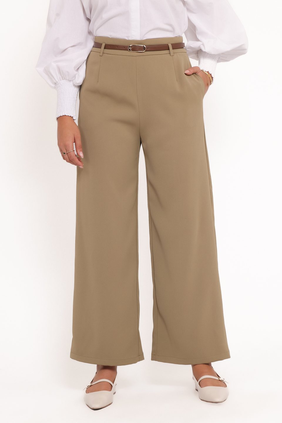 DETAILS Step into timeless sophistication with our stylish Wide Leg Pant! The high-waisted design and gathered pleated waistband give you a flattering silhouette that's perfect for any occasion. wide leg style pant high waisted gathered pleated waist band front functional zip with hook and eye clasp belt loops with det