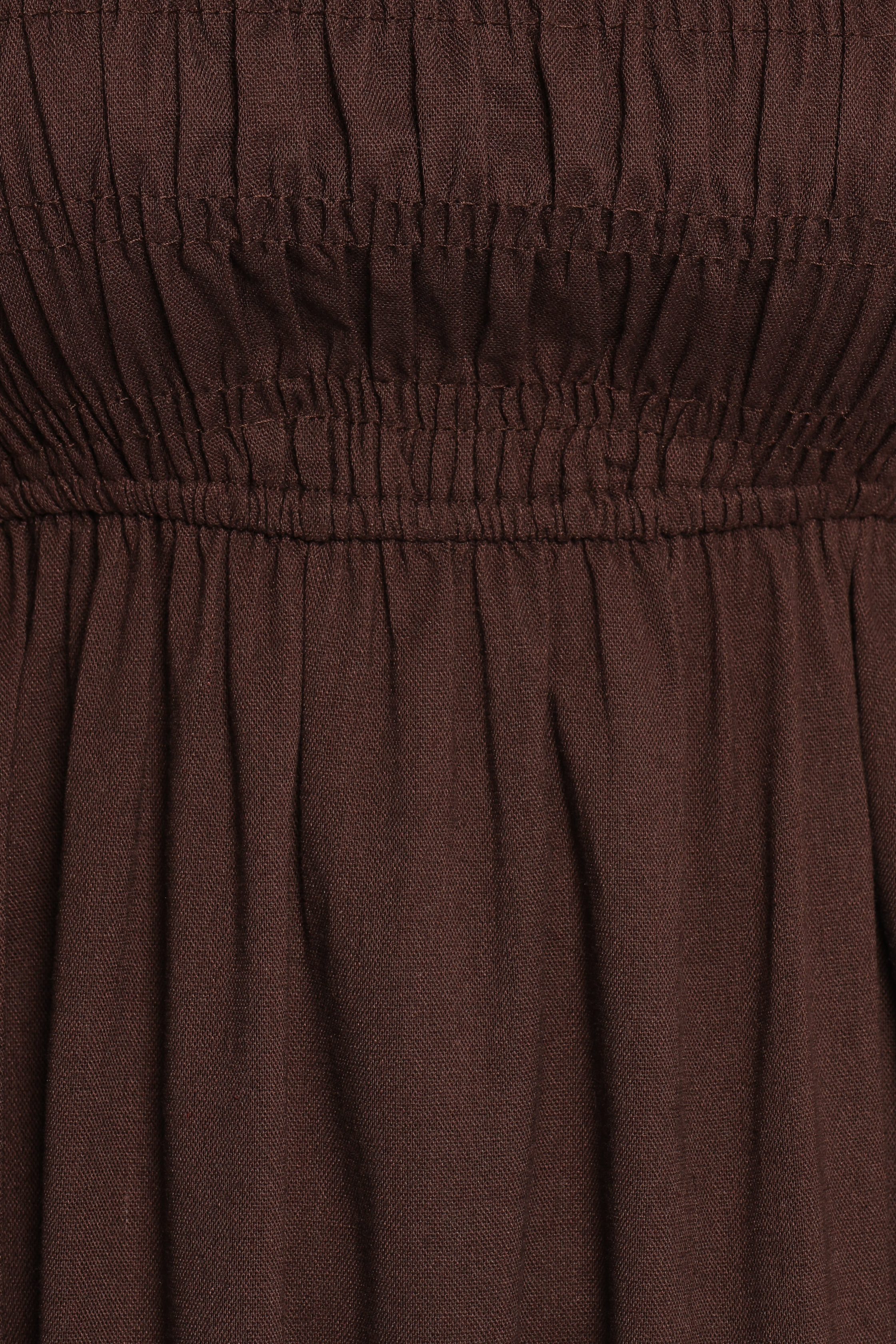 DETAILS Effortlessly elevate your wardrobe with the Lanna Maxi Dress in Chocolate. This versatile piece combines comfort with timeless style, featuring a flowing A-line skirt and an elasticised shirred bodice that hugs in all the right places. maxi length high mockneck neckline sleeveless design elasticised shirred bod