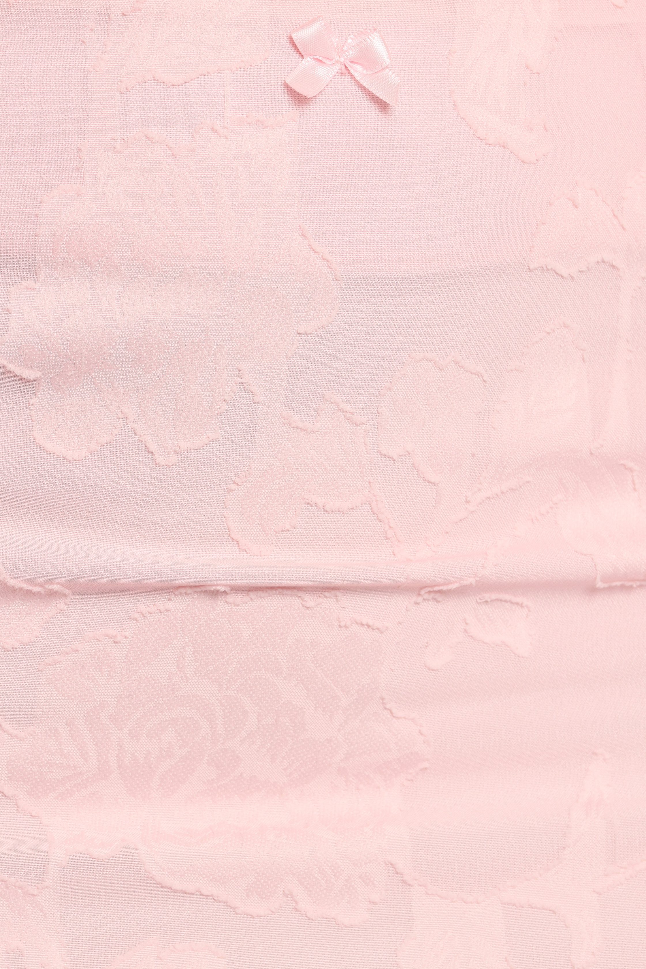 DETAILS This skirt features a dreamy pink floral embroidered print that looks as though it was plucked straight from a sunlit garden party. The maxi length drapes beautifully, creating a flowy silhouette that moves gracefully with you, while a delicate bow lace detail adds a touch of romance. maxi length invisible side