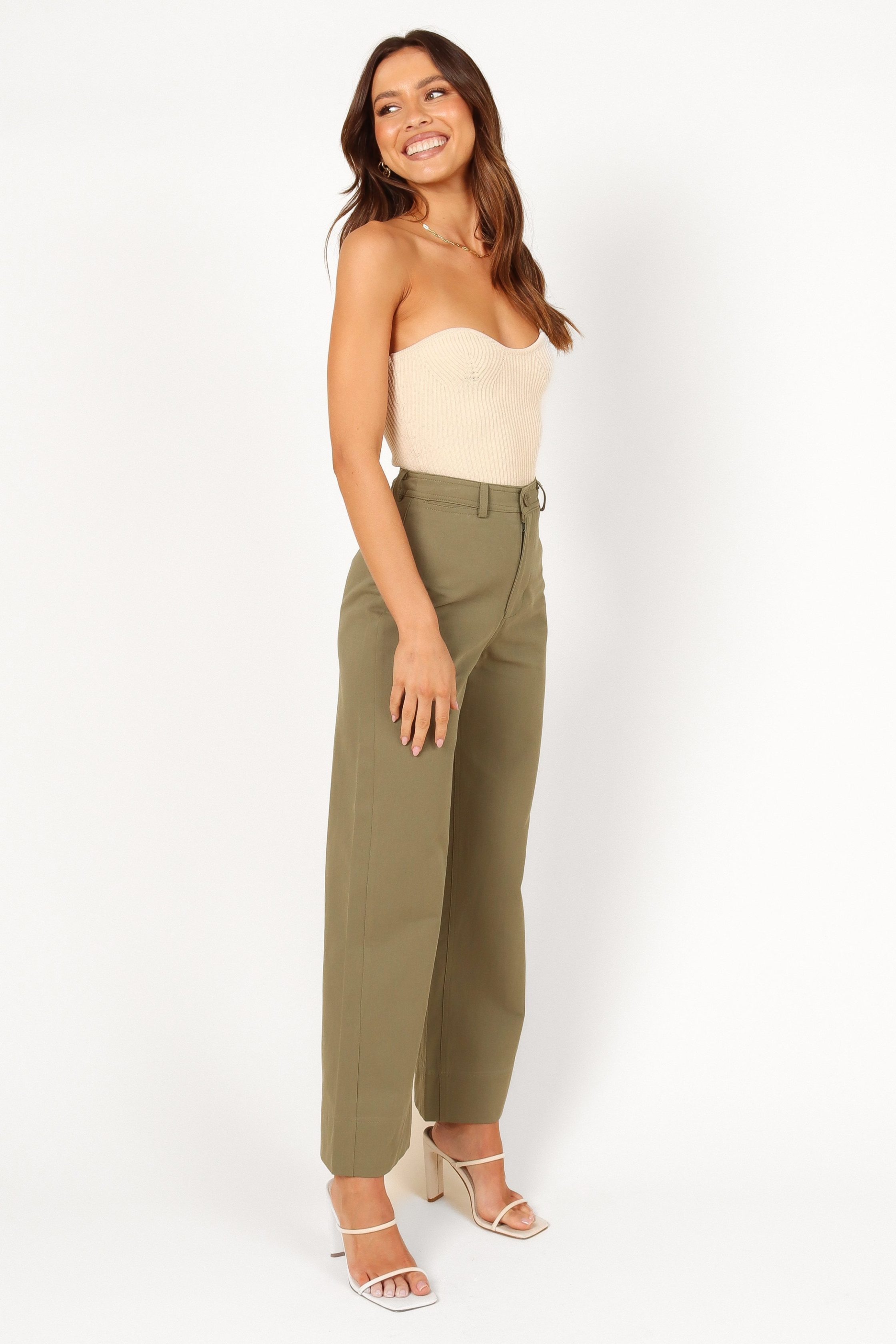 These pants are a must-have for any wardrobe! With their high waisted, straight leg style and functional front pockets, these pants provide a classic look that can be dressed up or down. The zip fly with button closure ensures your pants stay securely in place while the belt loops add subtle detail to complete the look. high waisted straight leg style pant front zip fly with button close front functional pockets belt loops relaxed fit unlined material – 100% cotton SIZING model is 5' 6" and wears a Size 2 model stats: bust – 31.5", waist – 24.5", hips – 34.5" GARMENT CARE cold hand wash separately