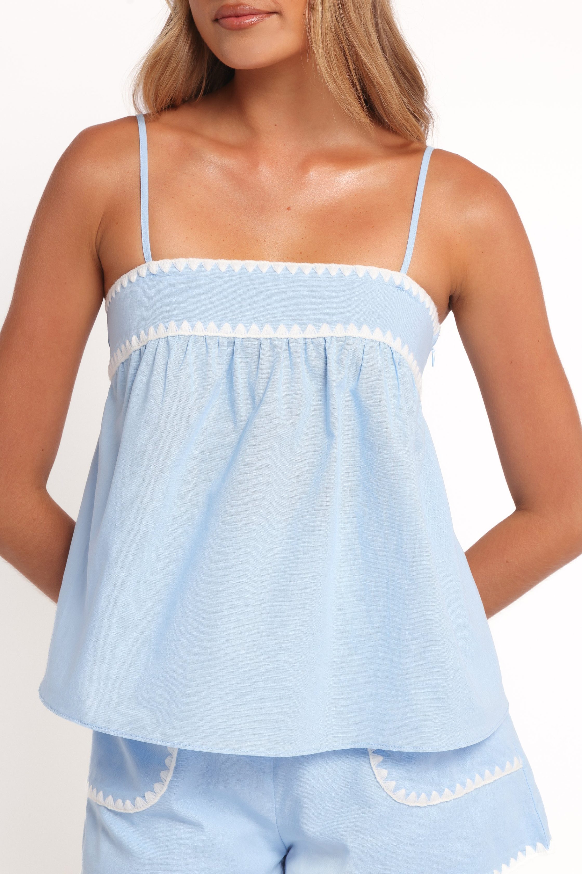 DETAILS Designed for comfort and charm, this two-piece set features a straight neckline and thin adjustable straps on the top with high-waisted shorts, complete with an invisible side zip and hook-and-eye clasp, delivering the perfect balance of structure and ease. top and short set straight neckline thin adjustable st