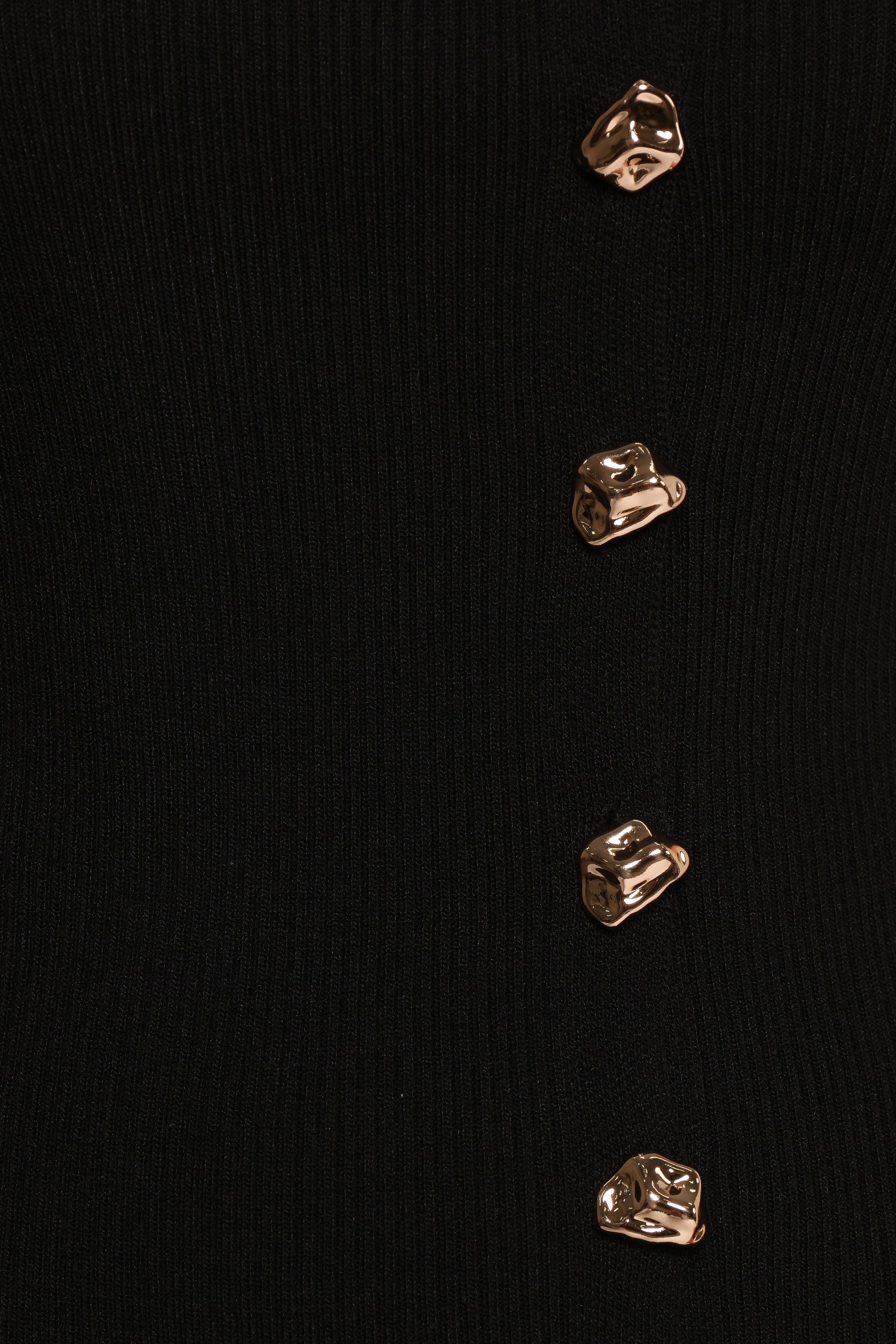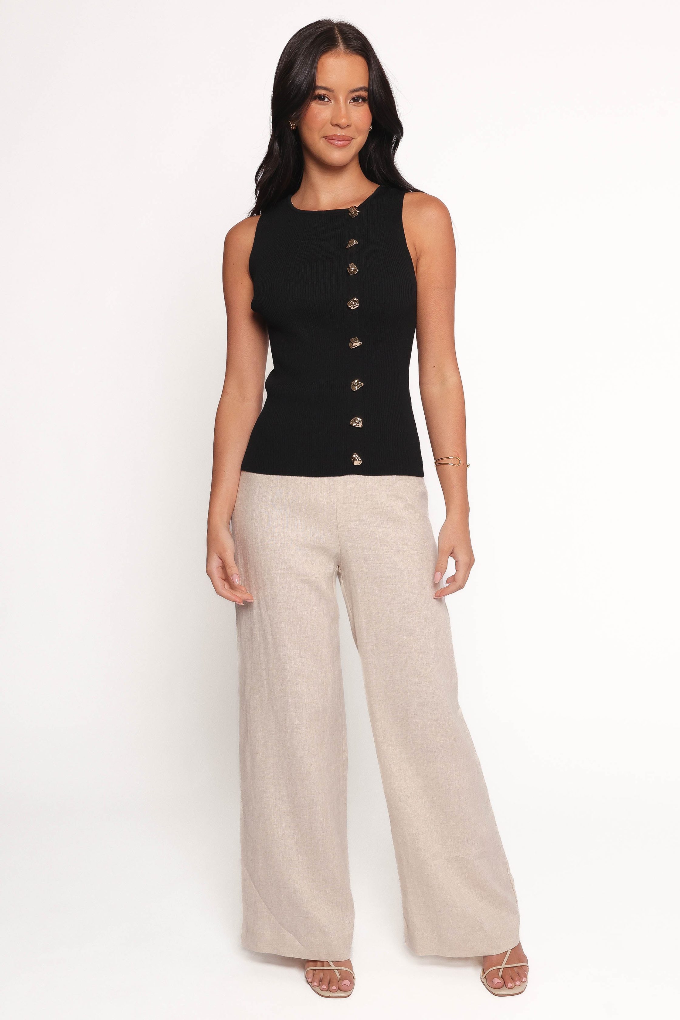DETAILS Add a versatile staple to your wardrobe with the Lysa Knit Vest Top. Featuring a round neckline and a sleeveless design, this piece is perfect for layering or standing out on its own. round neckline sleeveless design functional decorative buttons down front stretch ribbed knit unlined material – 61% polyester /