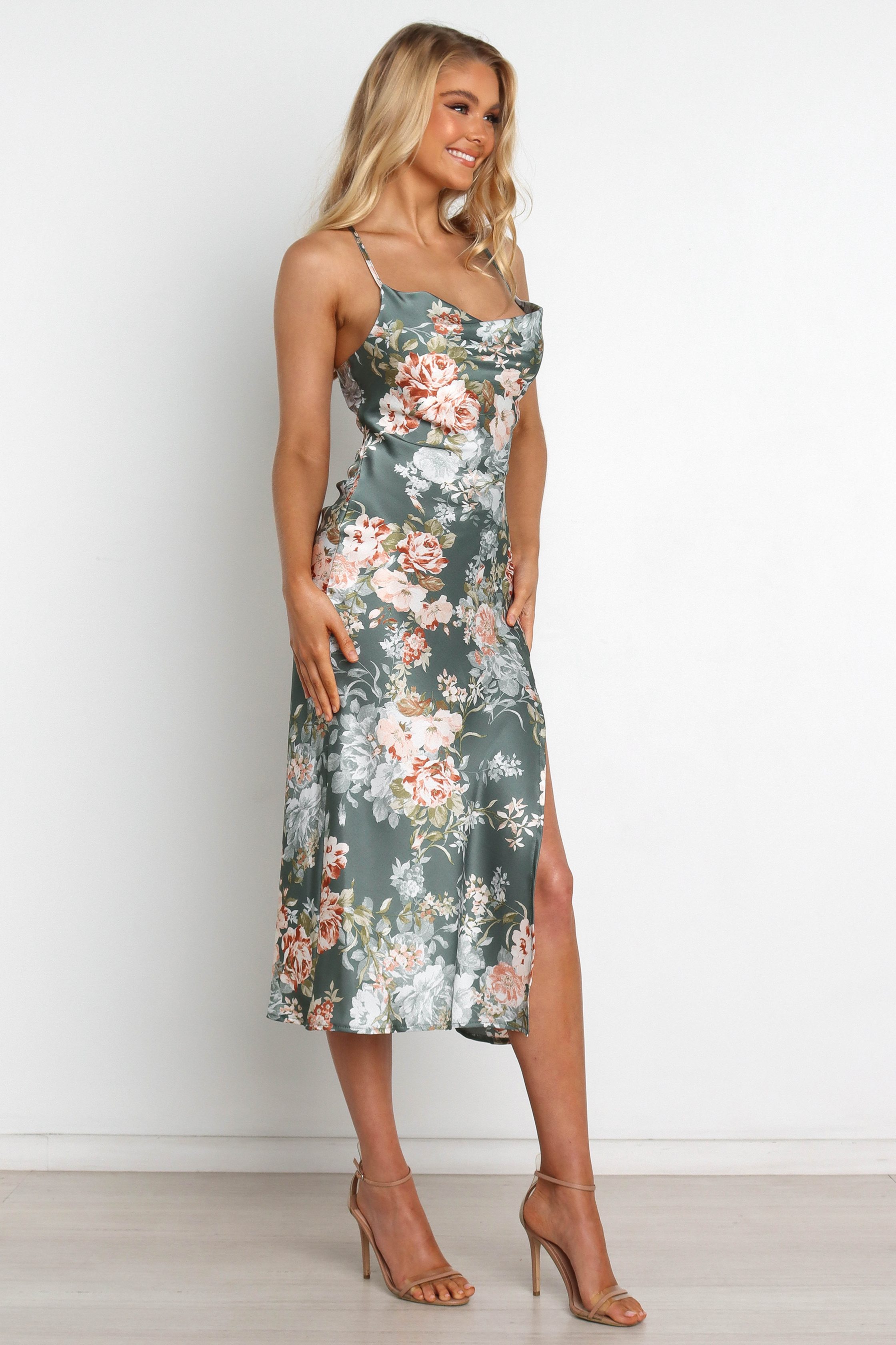 Make a statement for your next special occasion in this stunning midi dress! Featuring a cowl neckline, thin adjustable straps, satin sheen feel, and a beautiful floral print, this dress is sure to turn heads. midi length cowl neckline thin adjustable straps back tie close feature back cut out detail satin sheen feel front split feature floral print unlined SIZING model is 5' 6" and wears a Size 2 model stats: bust – 32", waist – 25", hips – 35" GARMENT CARE material – 100% polyester I'm delicate, cold hand wash separately
