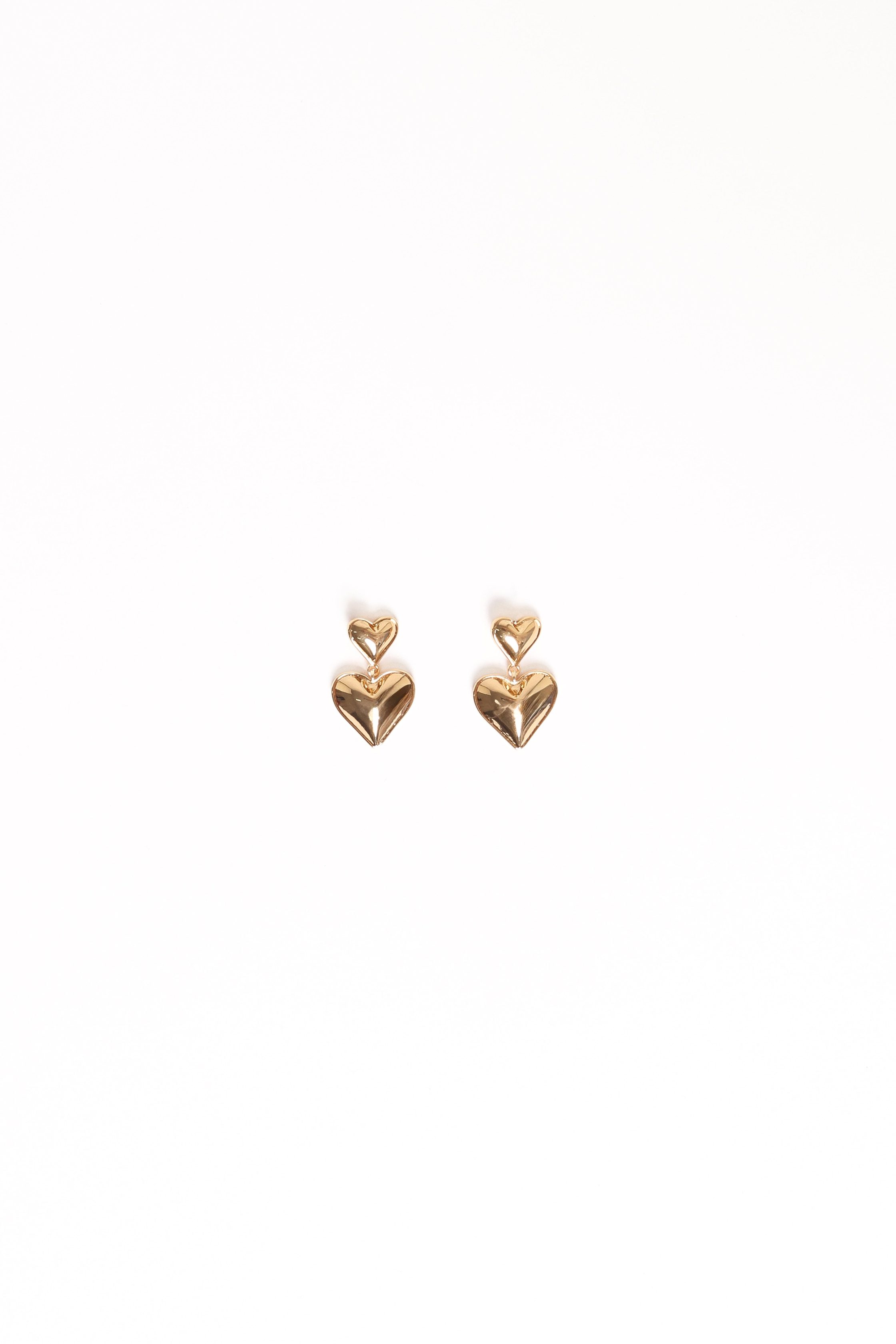 DETAILS Elevate your look with the Mariana Heart Earrings in Gold, a perfect fusion of timeless elegance and modern design. Featuring delicate drop-style earrings adorned with luminous decorative hearts, they exude understated glamour. drop style earrings decorative heart design gold hardware back stud closure material