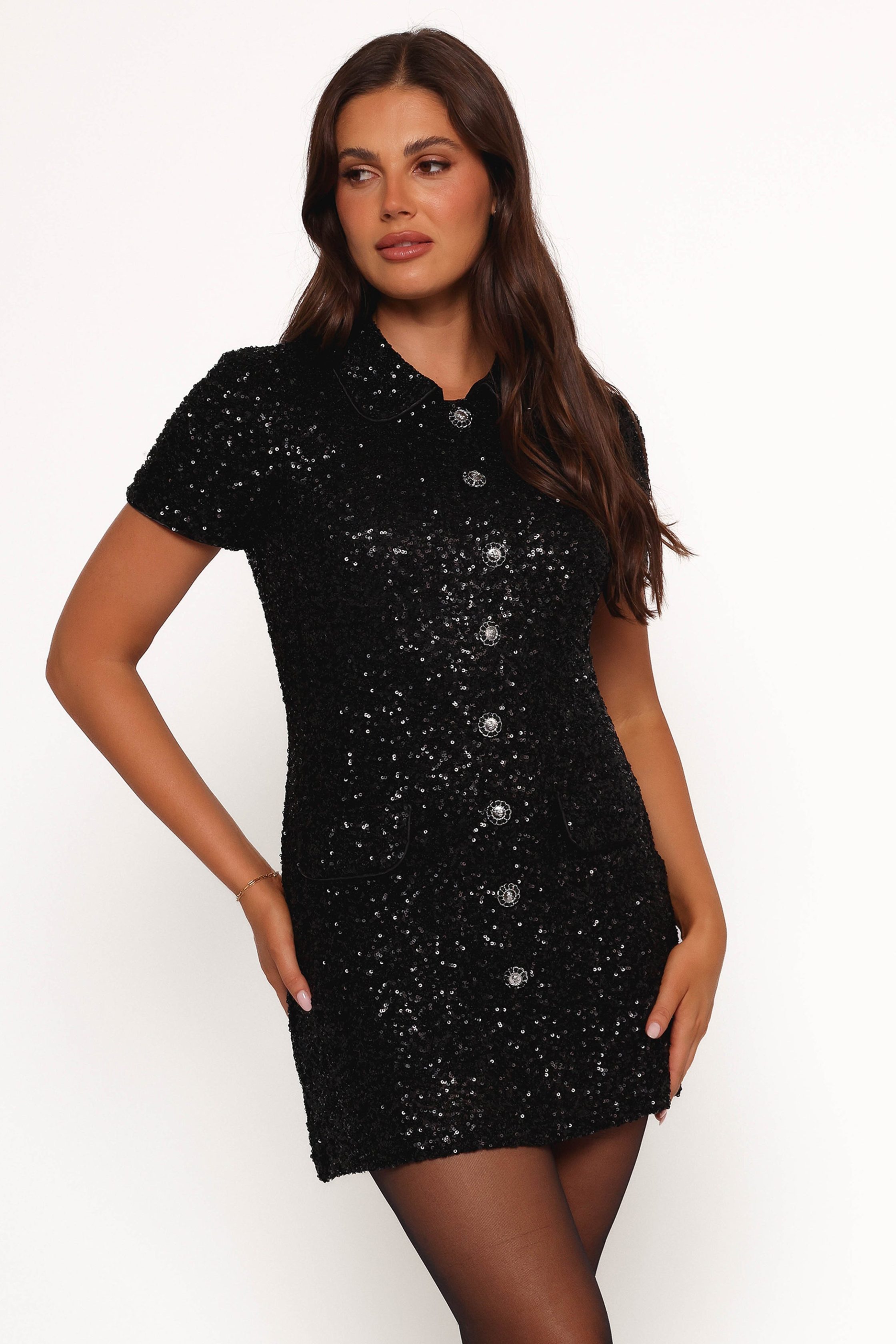 Designed with short sleeves and non-functional buttons down the front, this dress has an effortlessly cool vibe. The non-functional front pockets add a touch of detail, while the back invisible zip ensures a seamless fit. mini length collared high round neckline short sleeves non functional buttons down front back invisible zip non functional front pockets sequin feature lined material – 100% polyester SIZING studio model is 5' 7" and wears a Size S model stats: bust – 33", waist – 27", hips – 36" GARMENT CARE cold hand wash separately