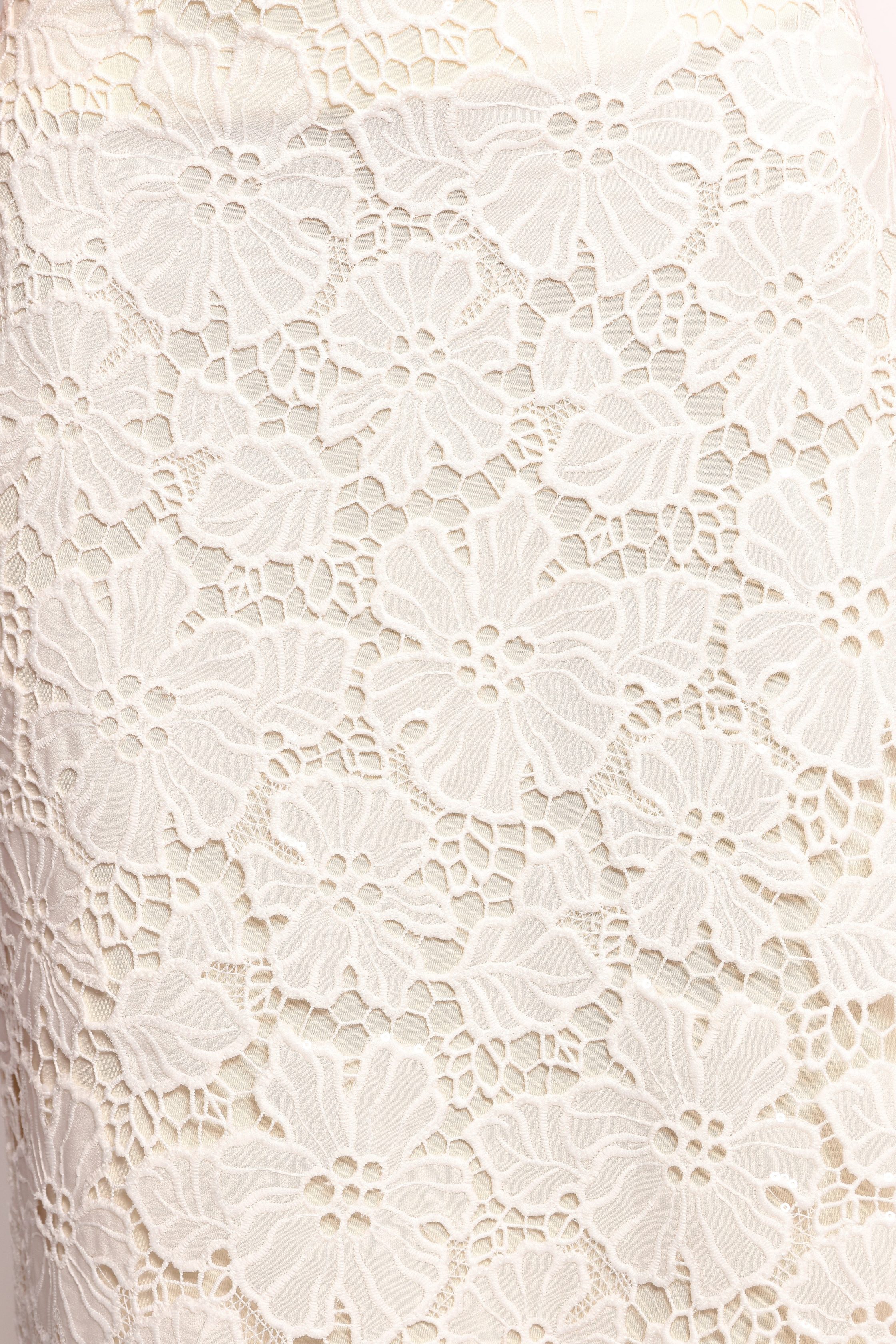 DETAILS Make a statement of timeless elegance with the Mika Floral Lace Maxi Skirt in classic white. Featuring a stunning floral lace overlay and delicate sequin accents, this skirt exudes sophistication for any occasion, be it a garden party, bridal shower, or chic evening soiree. maxi length back invisible zip with h