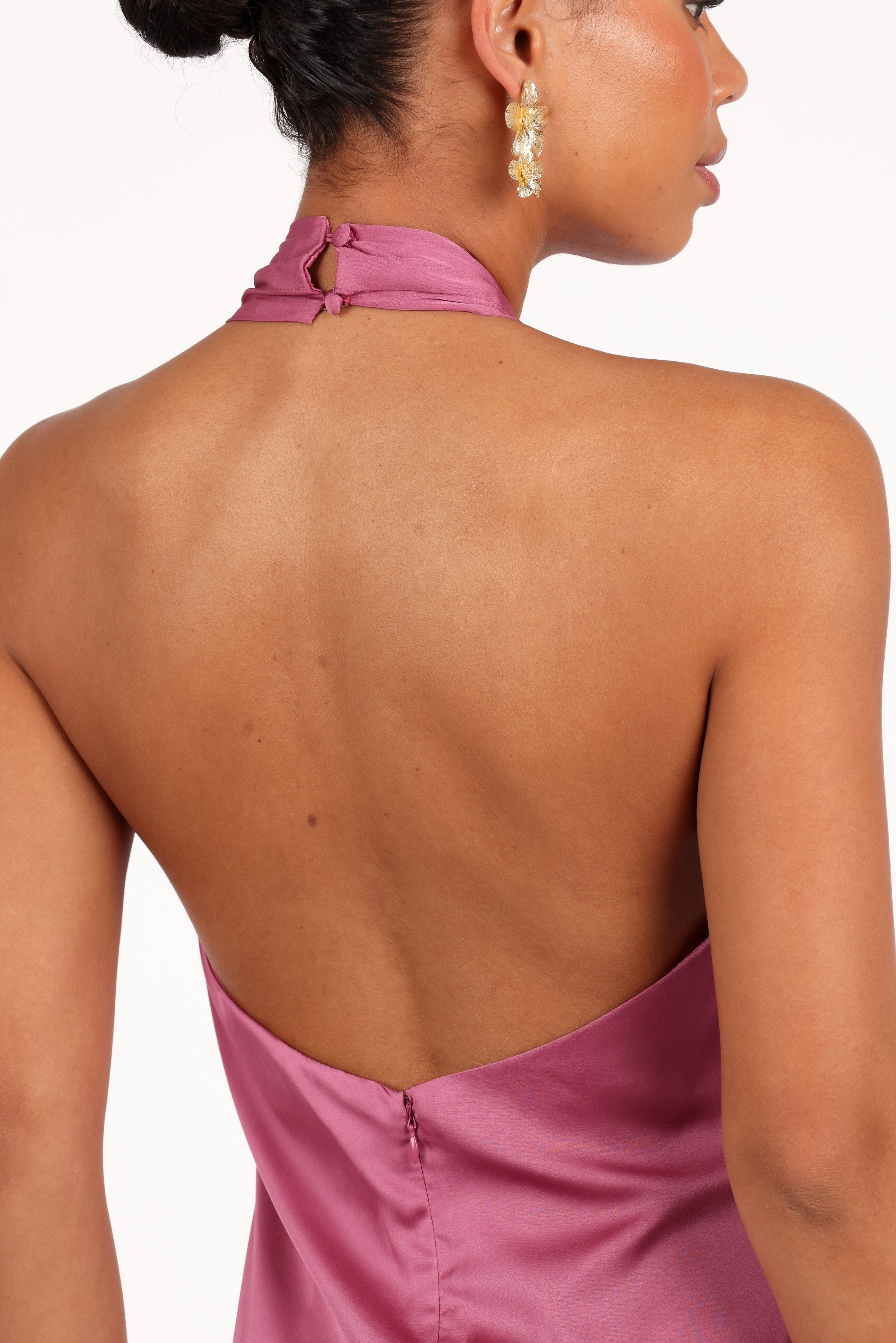 Expertly designed with a flirty halter neck that secures with a chic button close, this sleeveless stunner ensures you're always best dressed at any occasion. But wait, there's more – a hidden back zip with a hook and clasp ensures a perfect fit while adding a touch of mystique. maxi length halter neck with button close sleeveless design invisible back zip with hook and clasp satin sheen finish lined material – 100% polyester SIZING Studio model is 5' 10" and wears a Size S model stats: bust – 32", waist – 24.5", hips – 35" Modern Romance Campaign Estelle is 5' 8" and wears a Size XS model stats: bust – 31.5", waist – 25.5", hips – 34.5" GARMENT CARE cold hand wash separately