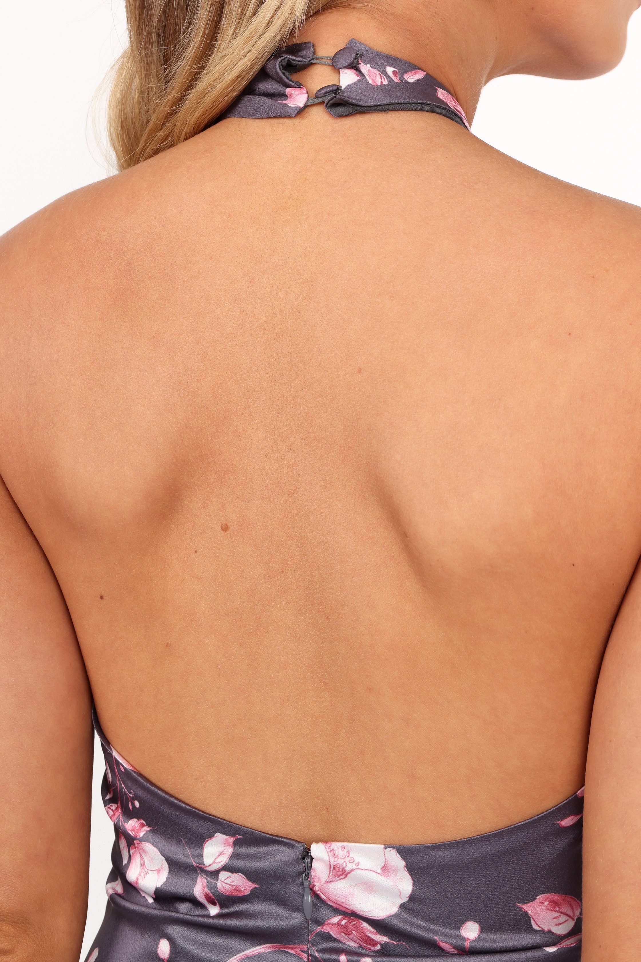 Expertly designed with a flirty halter neck that secures with a chic button close, this sleeveless stunner ensures you're always best dressed at any occasion. But wait, there's more – a hidden back zip with a hook and clasp ensures a perfect fit while adding a touch of mystique. maxi length halter neck with button close sleeveless design invisible back zip with hook and clasp floral print lined material – 100% polyester SIZING Studio model is 5' 5" and wears a Size XS model stats: bust – 31.5", waist – 25.5", hips – 37" Modern Romance Campaign; Melita is 5' 8" and wears a Size S model stats: bust – 36", waist – 25", hips – 36" GARMENT CARE cold hand wash separately