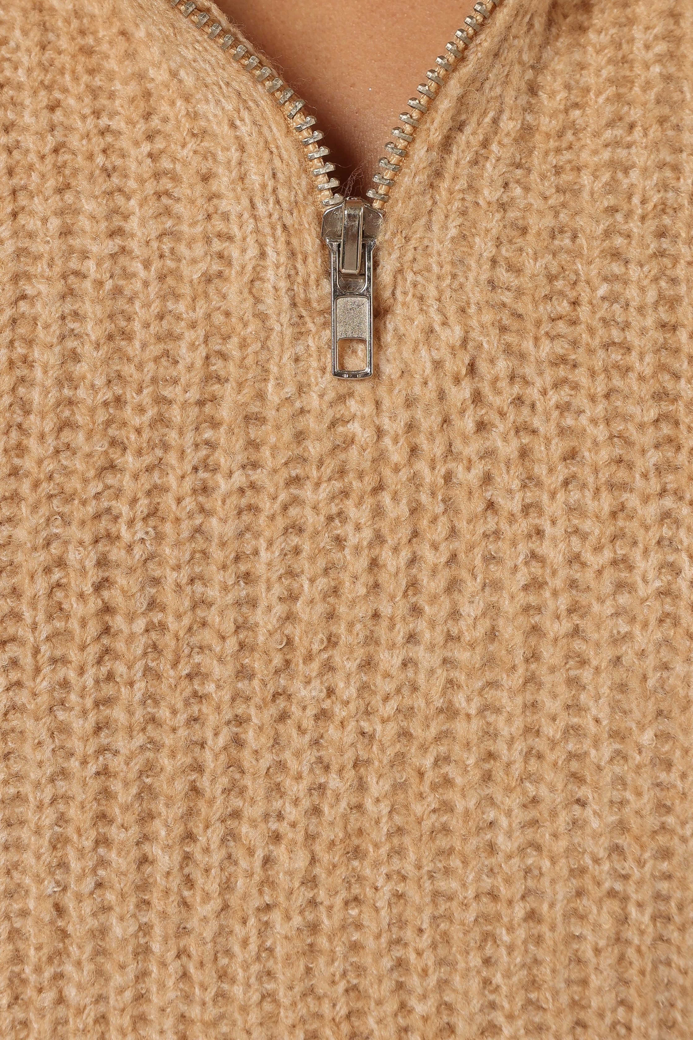 Stay cozy and stylish all season long in this knit sweater. Featuring a collar with zip down detail to add a hint of edge, this pull-on design will keep you warm in style. The long sleeves are finished off with ribbed cuffs for extra comfort, while the relaxed fit creates an effortlessly chic silhouette. long sleeves with ribbed cuffs ribbed hem collar with zip down detail pull on design relaxed fit unlined material – 70% acrylic / 30% nylon SIZING model is 5' 8" and wears a size S/M model stats: bust – 30.5", waist – 24", hips – 36.5" GARMENT CARE cold hand wash separately
