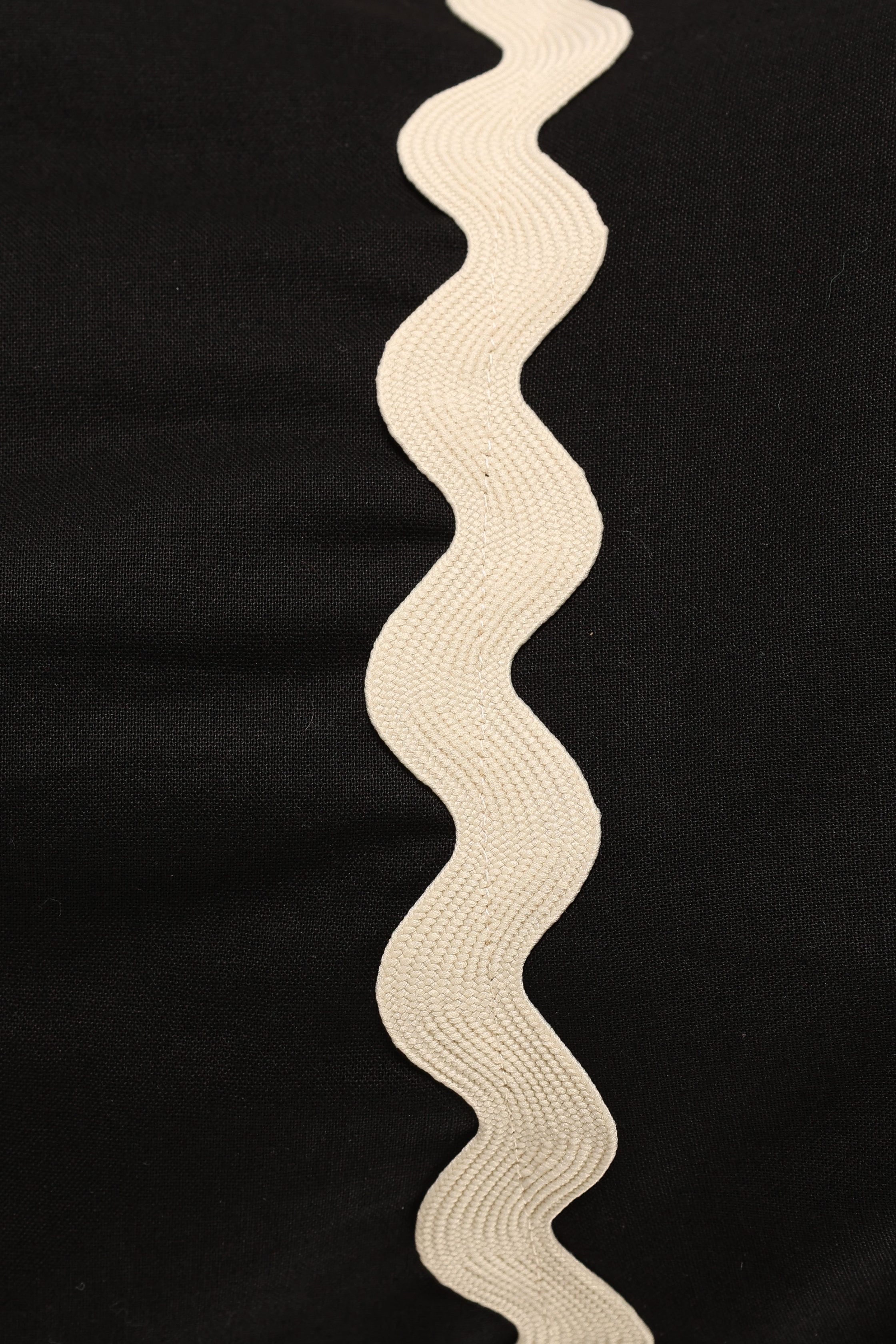 These wide leg pants are not only high on comfort, but they also promise to elevate your style game. Designed with a high waist and an elasticized waistband with drawstring close, they ensure a flattering silhouette that celebrates your fashion-forward spirit. wide leg style pant high waisted elasticised waistband with drawstring close ric rac design lined material – 100% cotton SIZING model is 5' 6" and wears a Size XS model stats: bust – 31", waist – 23", hips – 34" GARMENT CARE cold hand wash separately