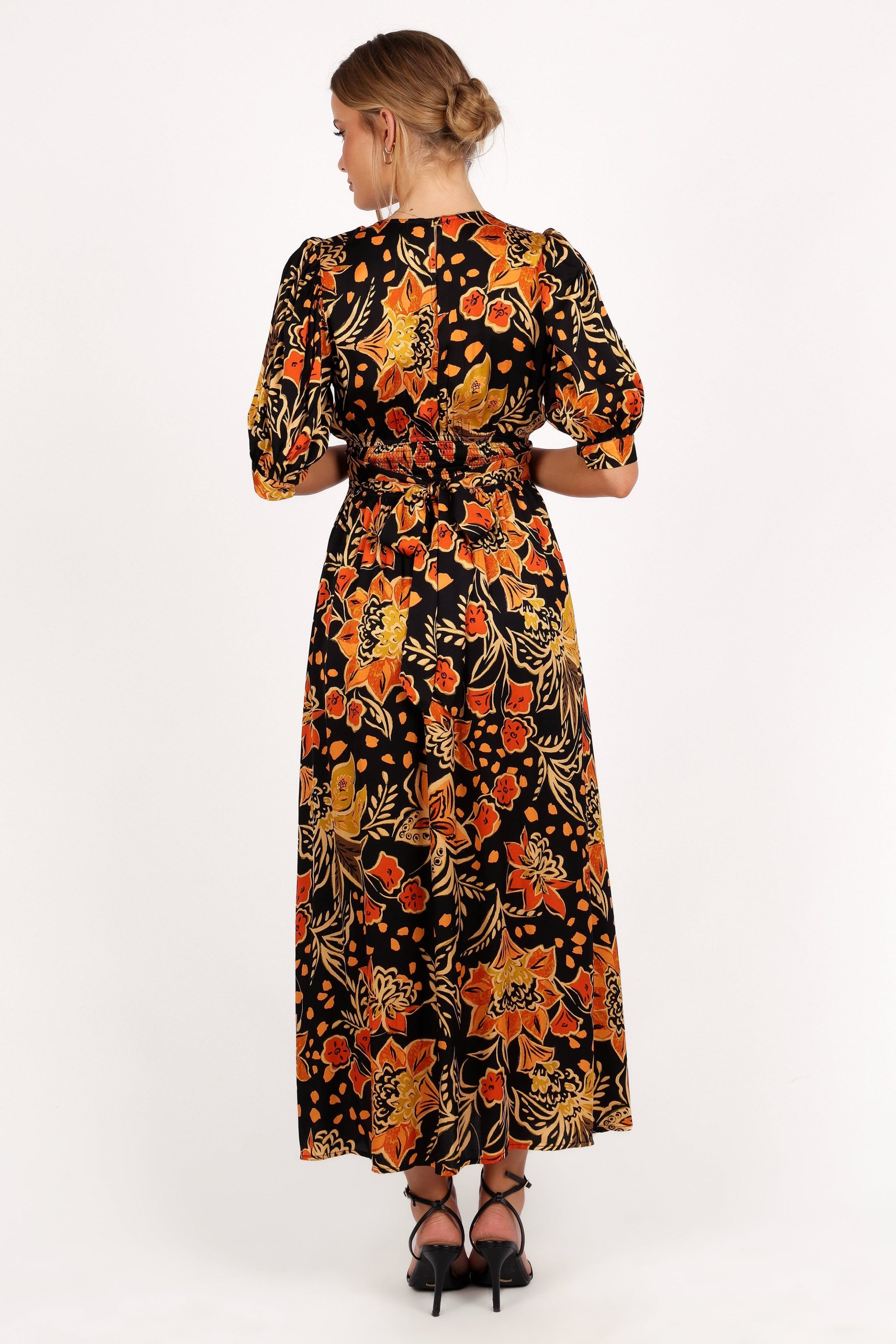 The Nadalyn Dress is the perfect outfit for events and everyday, in a stunning midi length with a v-neckline, short sleeves, and back tie detail. Dress it up with heels or go more casual with sandals. midi length v neckline short sleeves with button cuff close shirred waist at back back tie detail front split feature unlined material – 55% viscose / 45% rayon lining – 100% polyester SIZING model is 5' 8" and wears a Size S model stats: bust – 30.5", waist – 24", hips – 36.5" GARMENT CARE cold hand wash separately