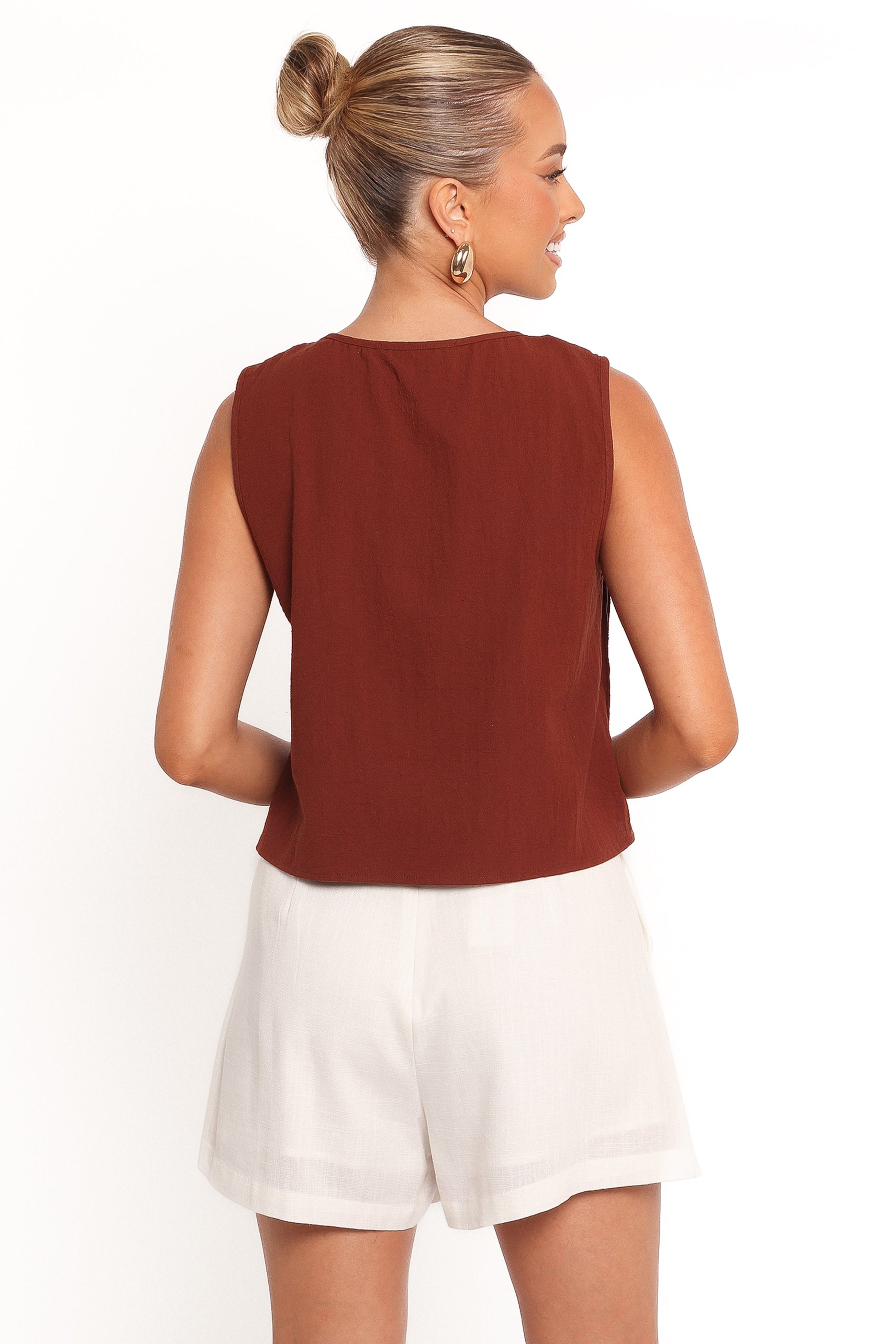 Effortlessly chic and endlessly versatile, the Nika Pleated Top in Chocolate Brown is destined to become your new wardrobe favorite. With its open v-neckline and delicate tie-close detail, this sleeveless design strikes the perfect balance between relaxed elegance and modern sophistication. open v neckline with tie close detail sleeveless design pleated detail unlined material – 100% cotton SIZING GARMENT CARE cold hand wash separately