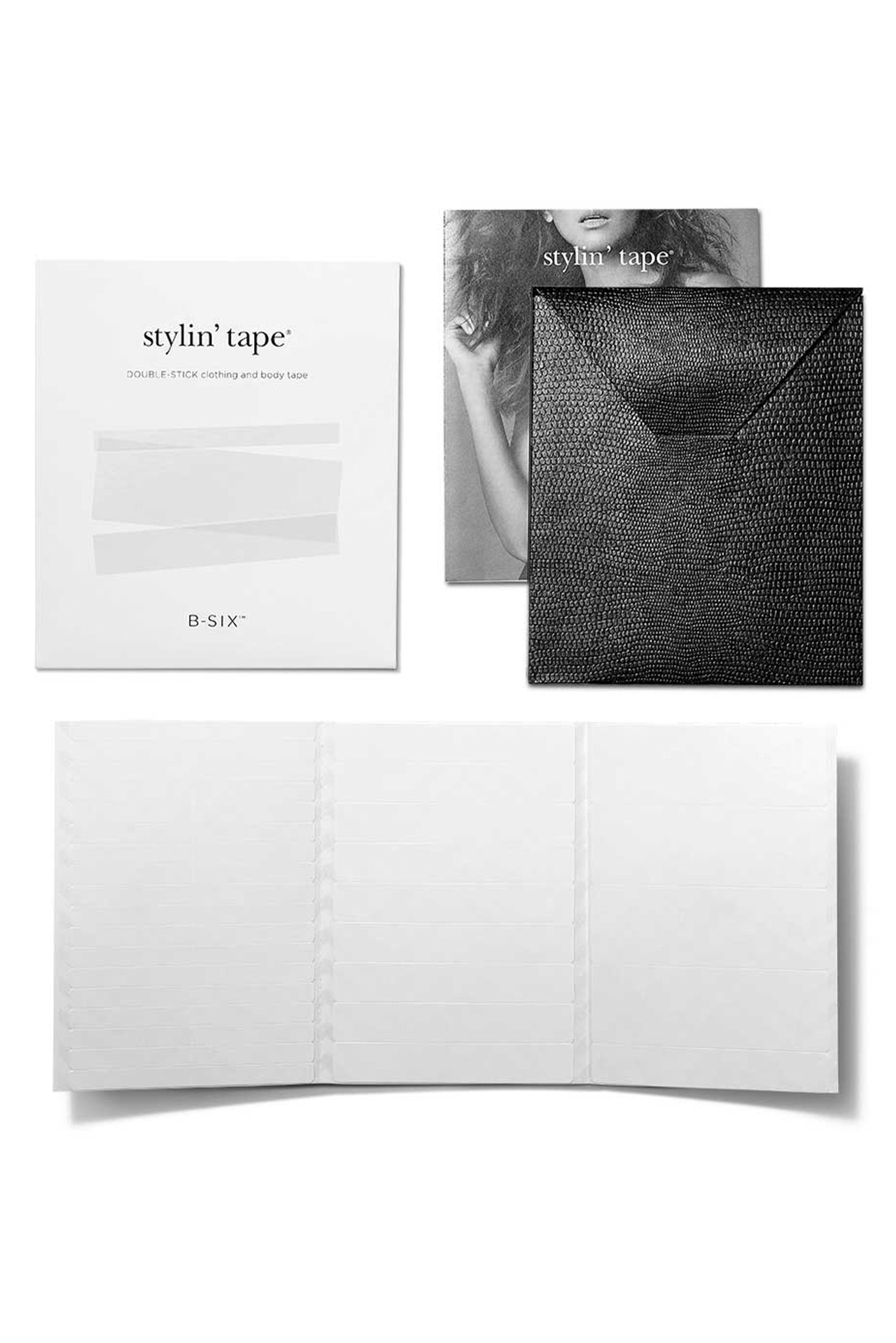 high quality double stick clothing and body tape each pack contains 32 pieces in 3 exclusive precut widths 18 thin strips for lightweight fabrics that need to flow 10 medium strips secure low cut necklines and slipping straps 4 wide strips for better hold on strapless bras, tops and dresses won't pucker, damage or leave residue on fabric clear, skin safe adhesive stretches so it won't pop off quick fix for torn seams, fallen hems, broken zips and rips stylish faux-snakeskin envelope keeps tape clean and protected in purses
