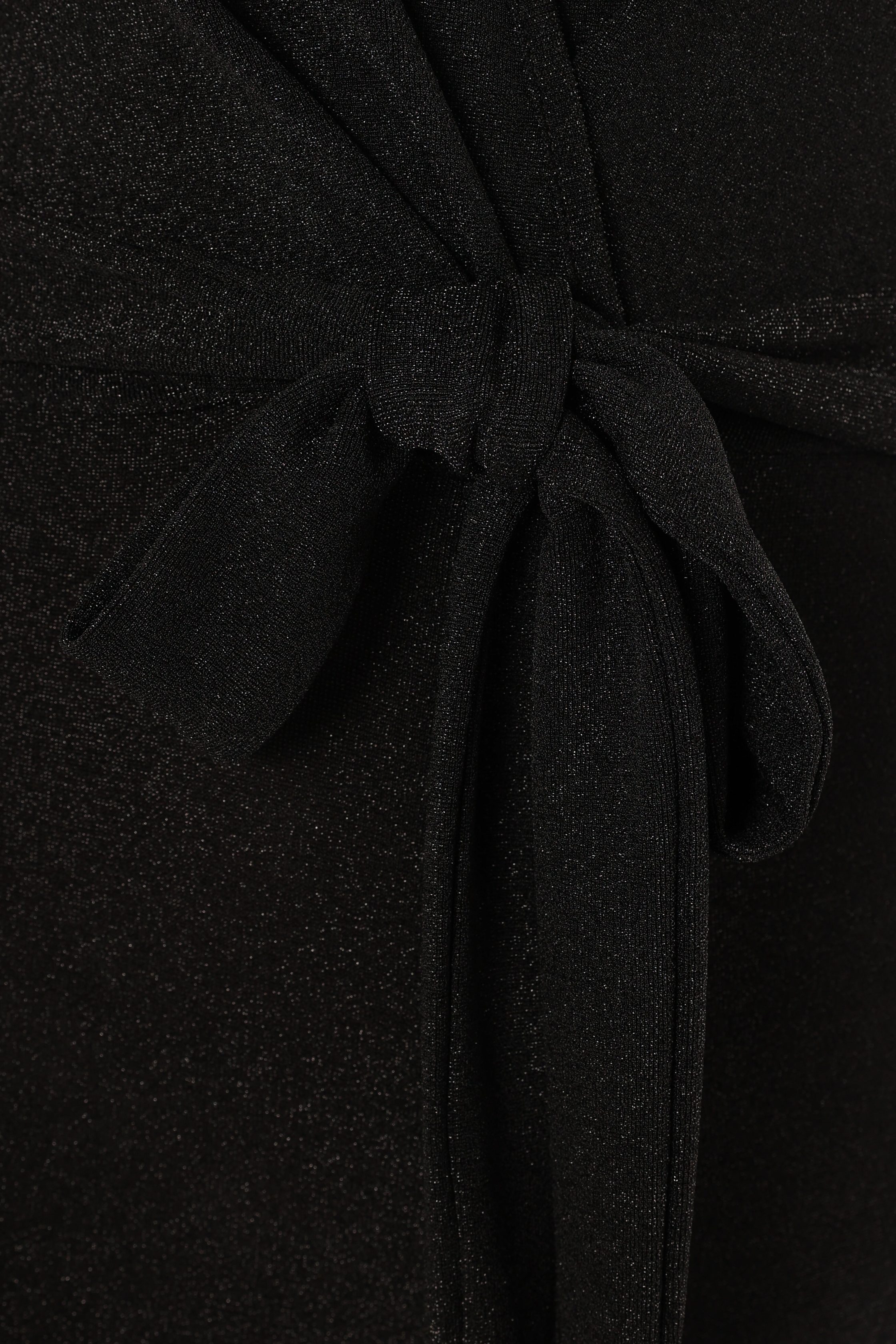 Introducing the perfect party jumpsuit! This beautiful sleeveless design is crafted from a luxurious black metallic material, and features an overlay neckline with hook and eye clasp. Additionally, a back v detail adds to its chic style. The wide leg silhouette is complemented by an elasticised waistband and detachable waist tie for extra comfort and versatility. v overlay neckline with hook and eye clasp sleeveless design wide leg style back v detail elasticised waist band detachable waist tie black metalic material unlined material – 100% polyester SIZING model is 5' 8" and wears a Size XS model stats: bust – 30.5", waist – 24", hips – 36.5" GARMENT CARE cold hand wash separately