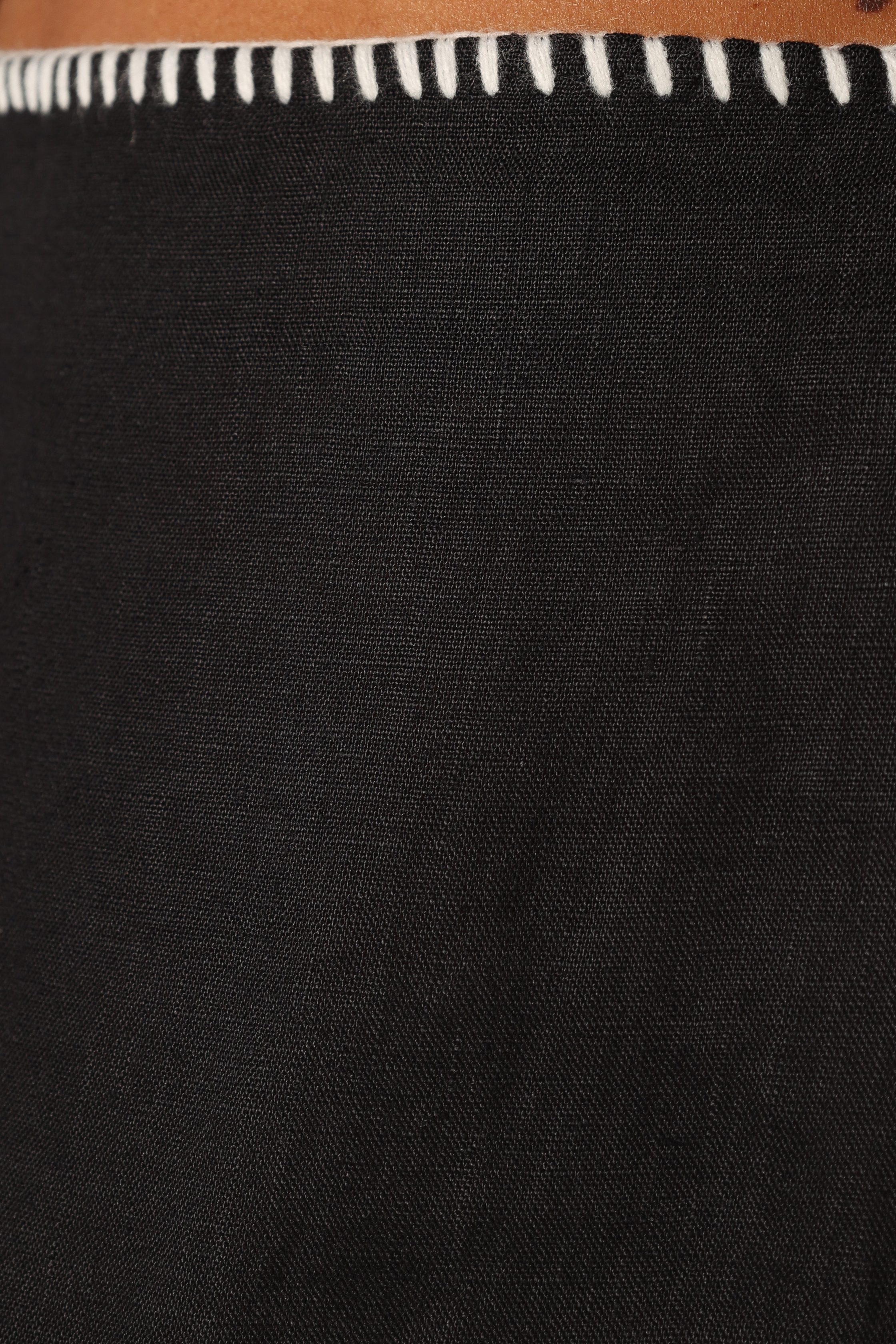 Stride with confidence in this striking midi-length skirt. Featuring a high-waisted fit that's as flattering as it is comfortable, thanks to its elasticised waist. The white contrast stitching details add a playful, trendy touch, while the back split is a nod to fashion-forward innovation. midi length high waisted style elasticised waist white contrast stitching back split pull on unlined material – 100% linen SIZING model is 5' 7" and wears a Size XS model stats: bust – 80cm, waist – 25", hips – 82c GARMENT CARE cold hand wash separately